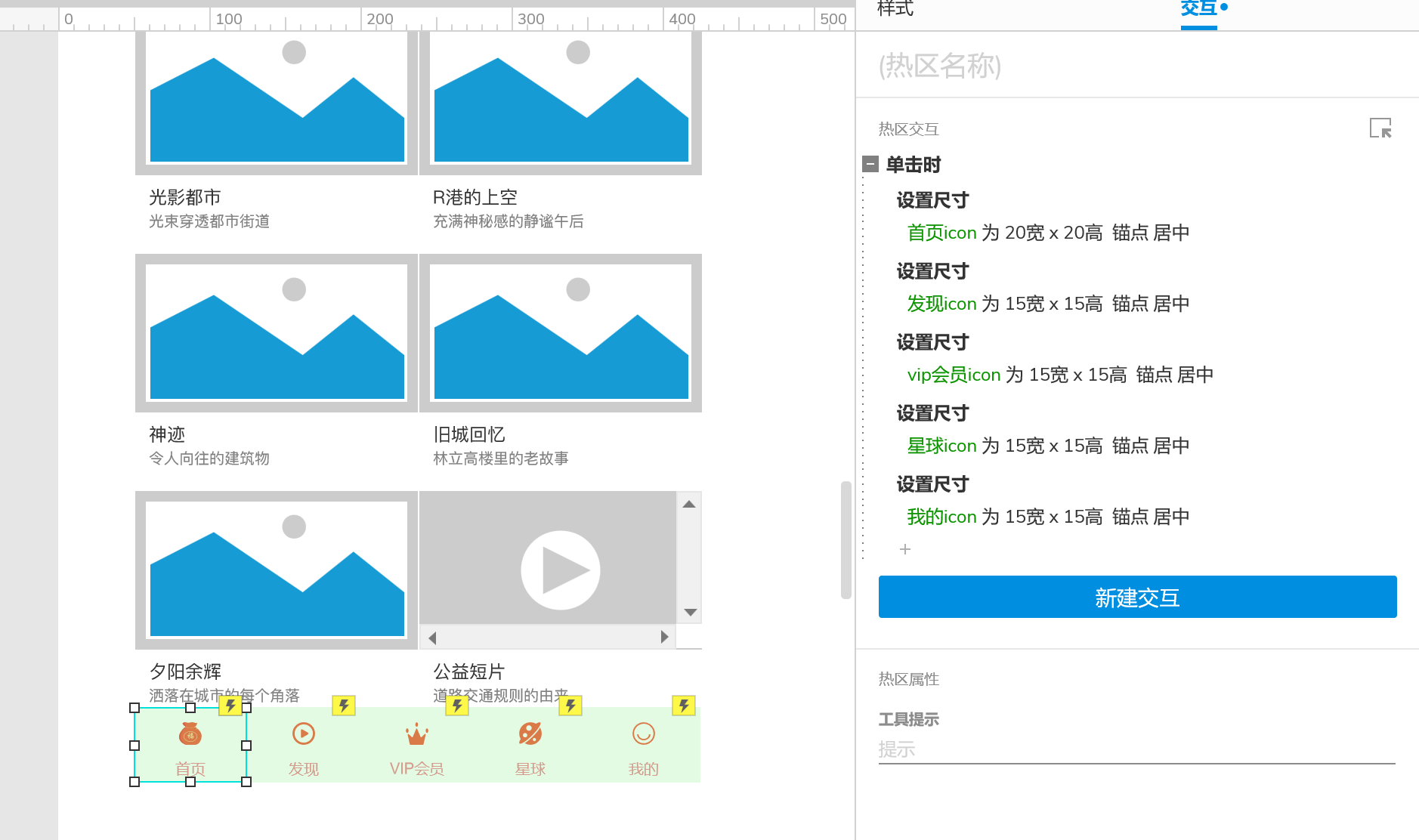 4、接下来分别给【首页】【发现】【vip会员】【星球】【我的】覆盖上热点,并分别做以下交互,这样随着点击图标方式的样式就实现啦。
