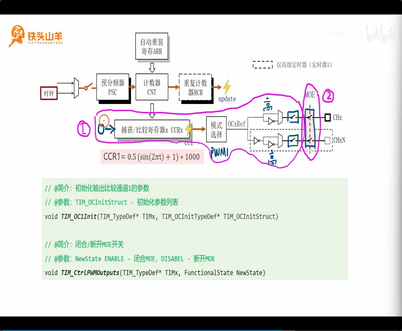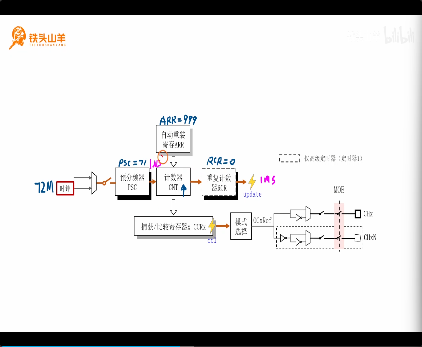 MOE:主输出使能,使能主输出,使能后定时器的所有通道的信号才能被使用