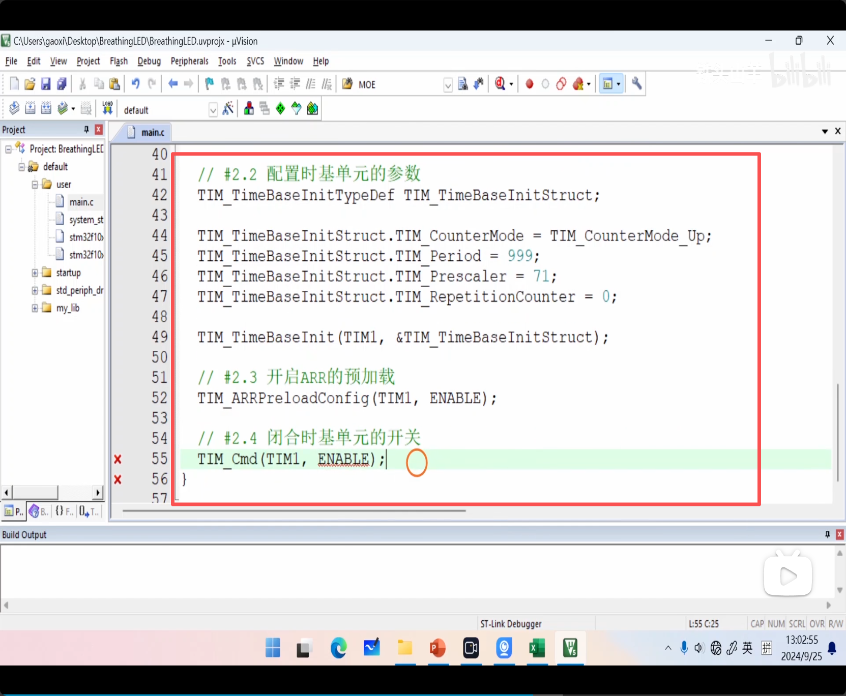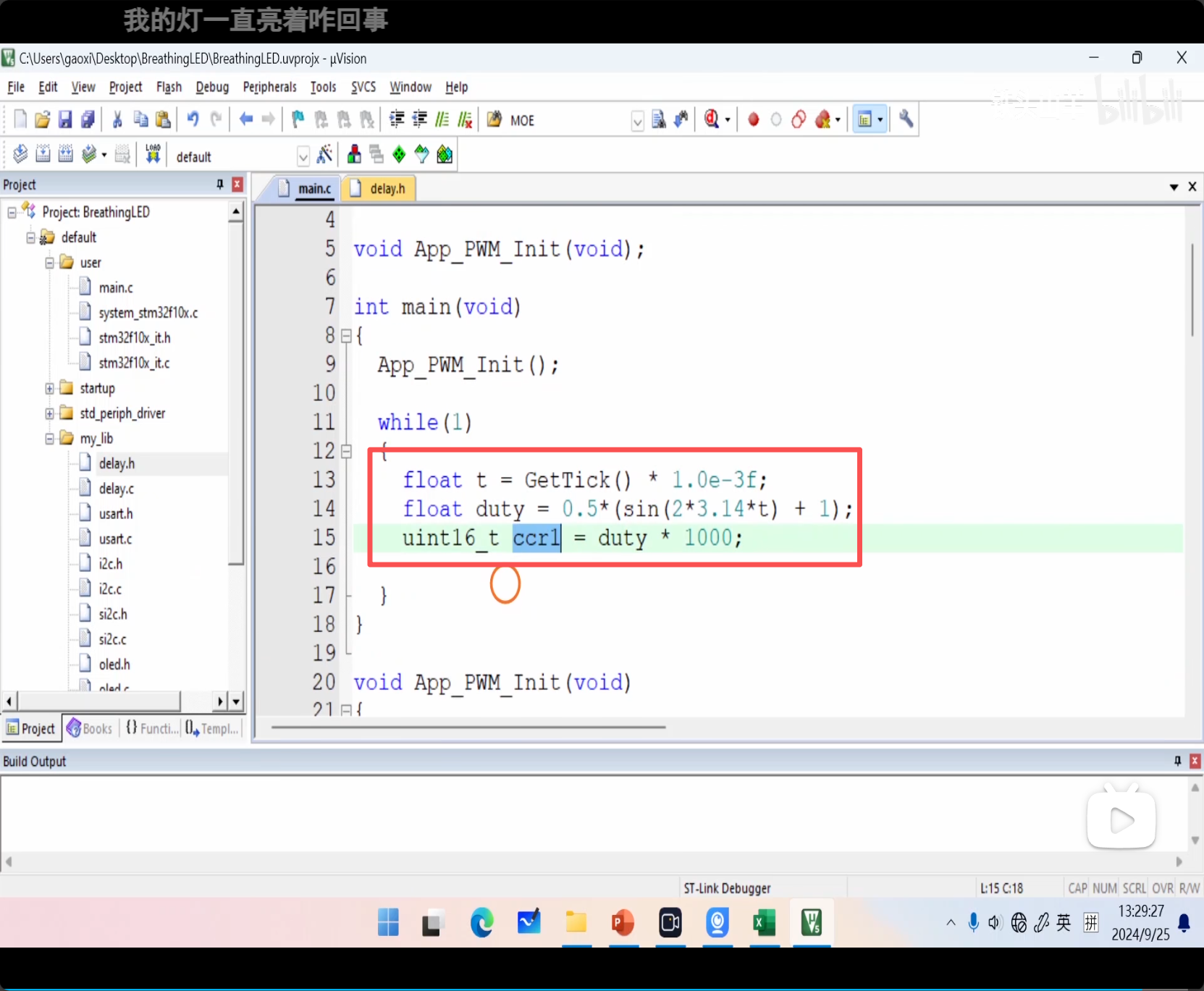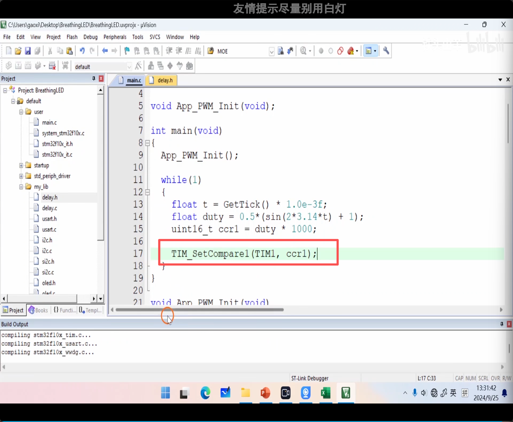 实现 PWM 呼吸灯核心逻辑: CCR 在 0~999(对应 0~1000)变化→占空比 0%~100% 连续调节→LED 高电平时间占比变化→平均电流 / 平均电压在 0~3.3V 之间平滑变化→人眼视觉暂留感知为亮度平滑变化→实现呼吸灯效果;