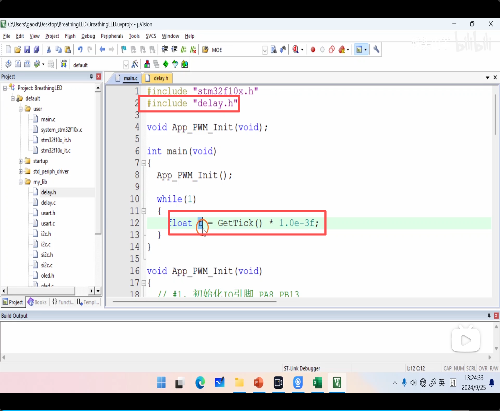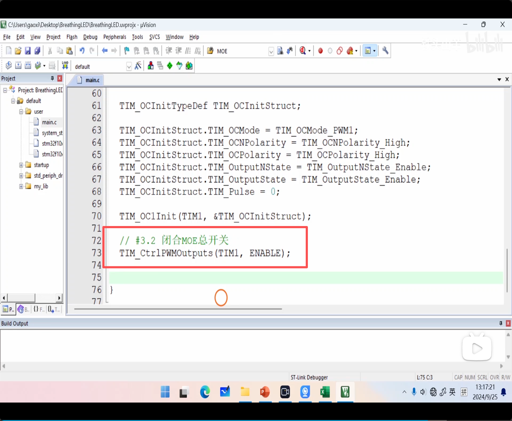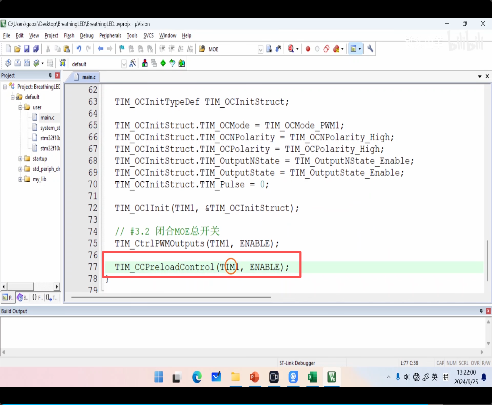 实现 PWM 呼吸灯核心逻辑: CCR 在 0~999(对应 0~1000)变化→占空比 0%~100% 连续调节→LED 高电平时间占比变化→平均电流 / 平均电压在 0~3.3V 之间平滑变化→人眼视觉暂留感知为亮度平滑变化→实现呼吸灯效果;