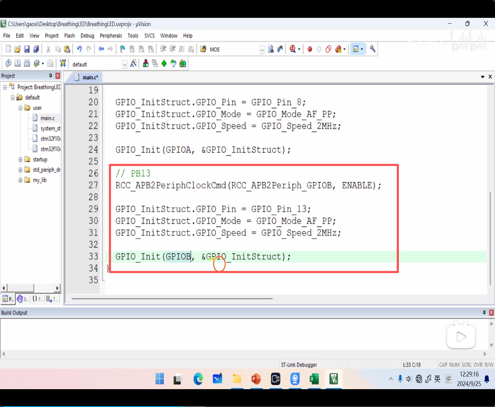 上图为初始化 PB13引脚具体代码,推挽复用输出
