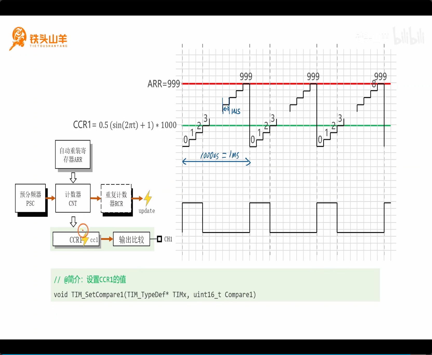 A:因为 ARR 值为 999,CNT 最高可加到 999,。CCR 要和 CNT 比较,0.5(sin(2πt)+1)的范围是(0,1),所以乘以 1000,让 CCR 的取值范围达到(0,1000),可以和 CNT 比较