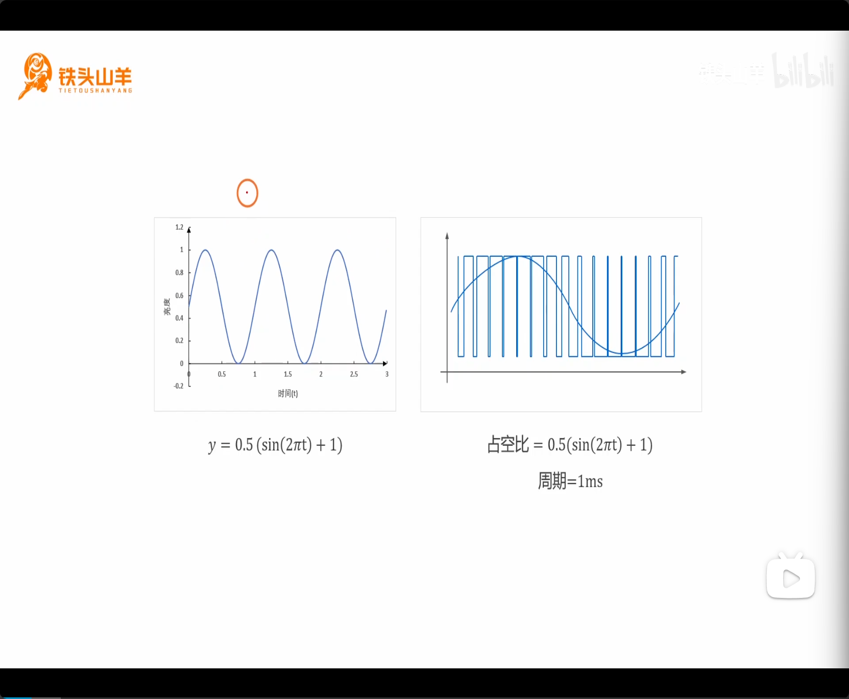 但是 MCU 只能输出两种电压:0 和 3.3V。所以需要通过 PWM 的占空比,模拟正弦波(连续模拟信号用数字信号表示)
