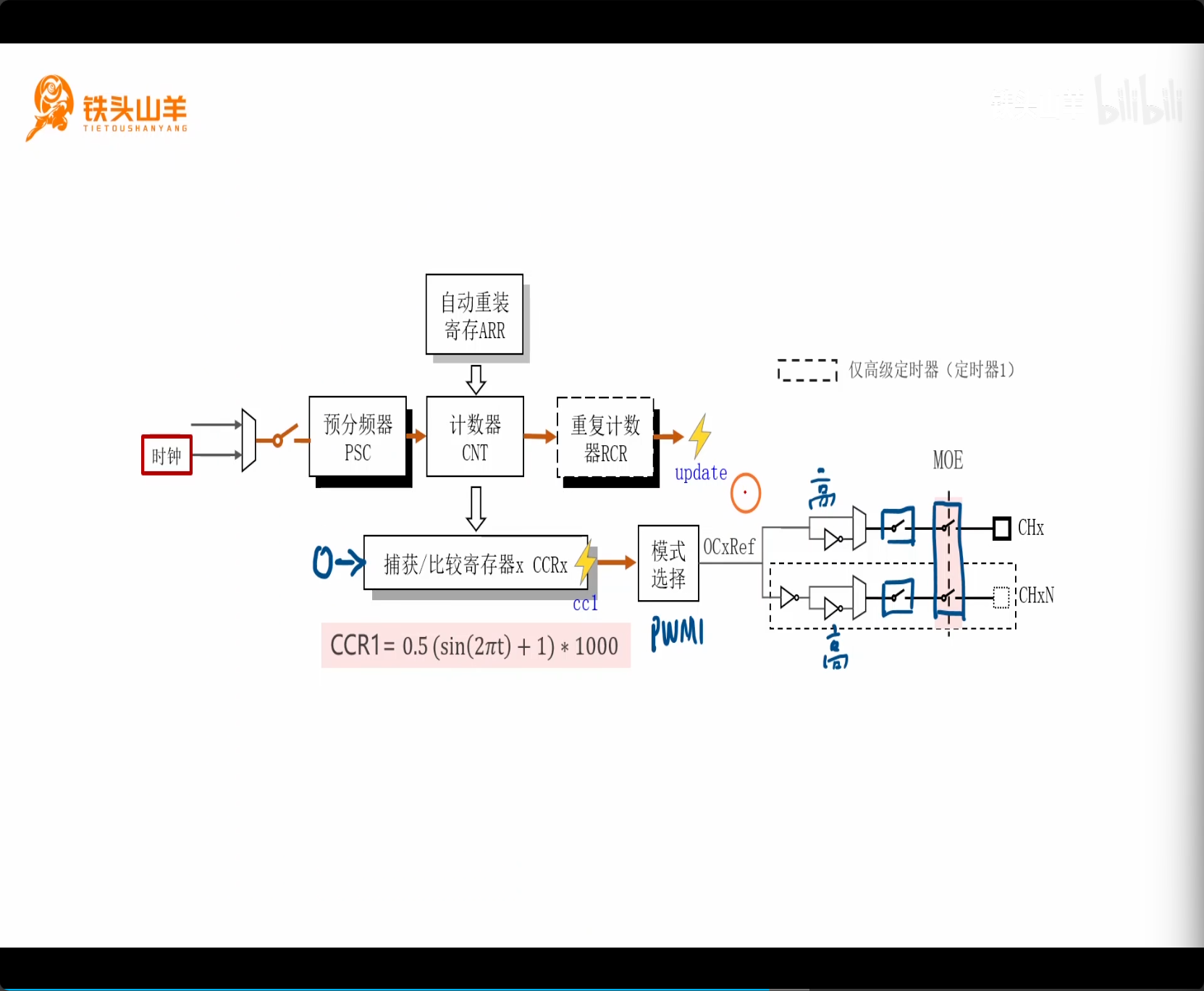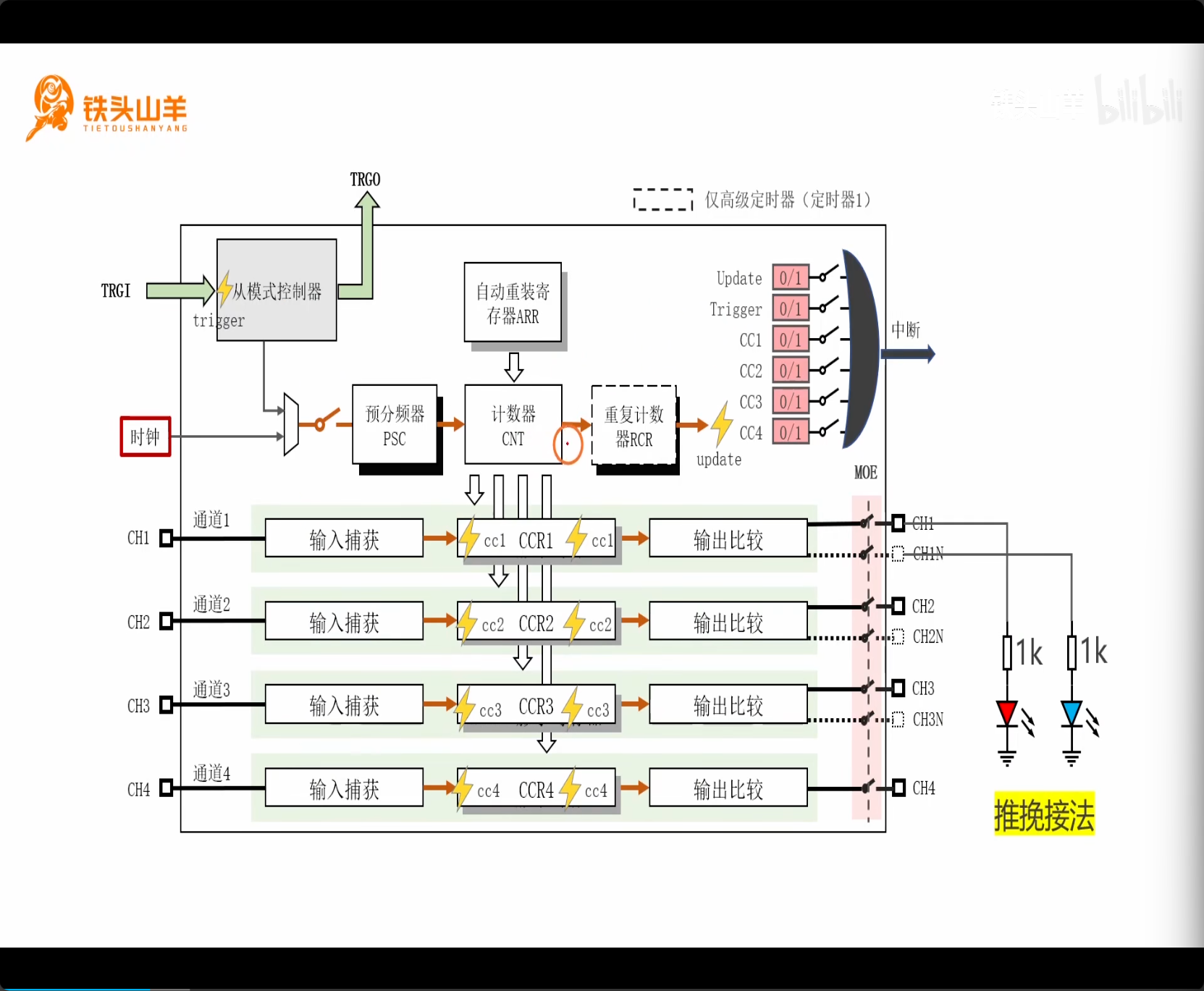 上图为定时器 1 内部框图。有四个通道,我们选择通道 1,红色 LED 接 CH1,蓝色 LED 接 CH1N(互补输出)。