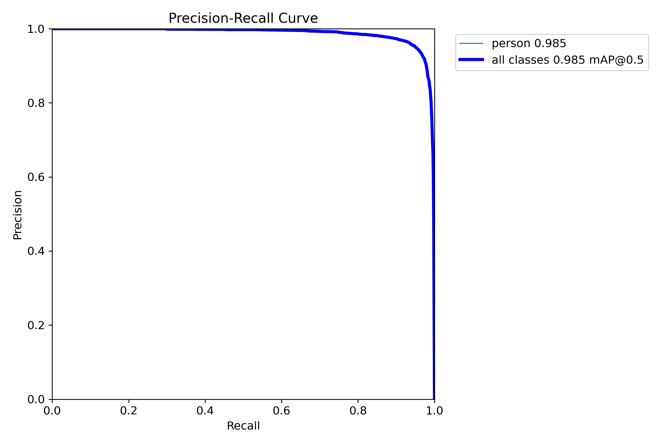 该图展示了精确度与召回率的关系,曲线表明模型在"person"类别的精确度和召回率均表现出很高的性能,且整体mAP@0.5值为0.985,表现出优秀的检测能力。