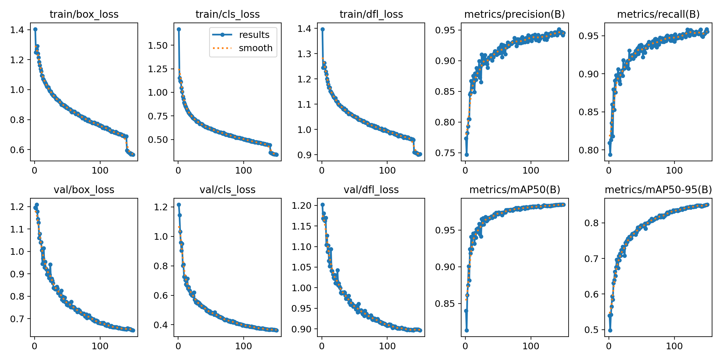 这张图展示了训练过程中不同损失函数(如box_loss、cls_loss、dfl_loss)以及性能指标(如precision、recall、mAP50等)的变化,蓝色曲线表示训练集结果,橙色虚线表示验证集结果,展示了模型在训练和验证过程中性能的逐步提升和收敛趋势。