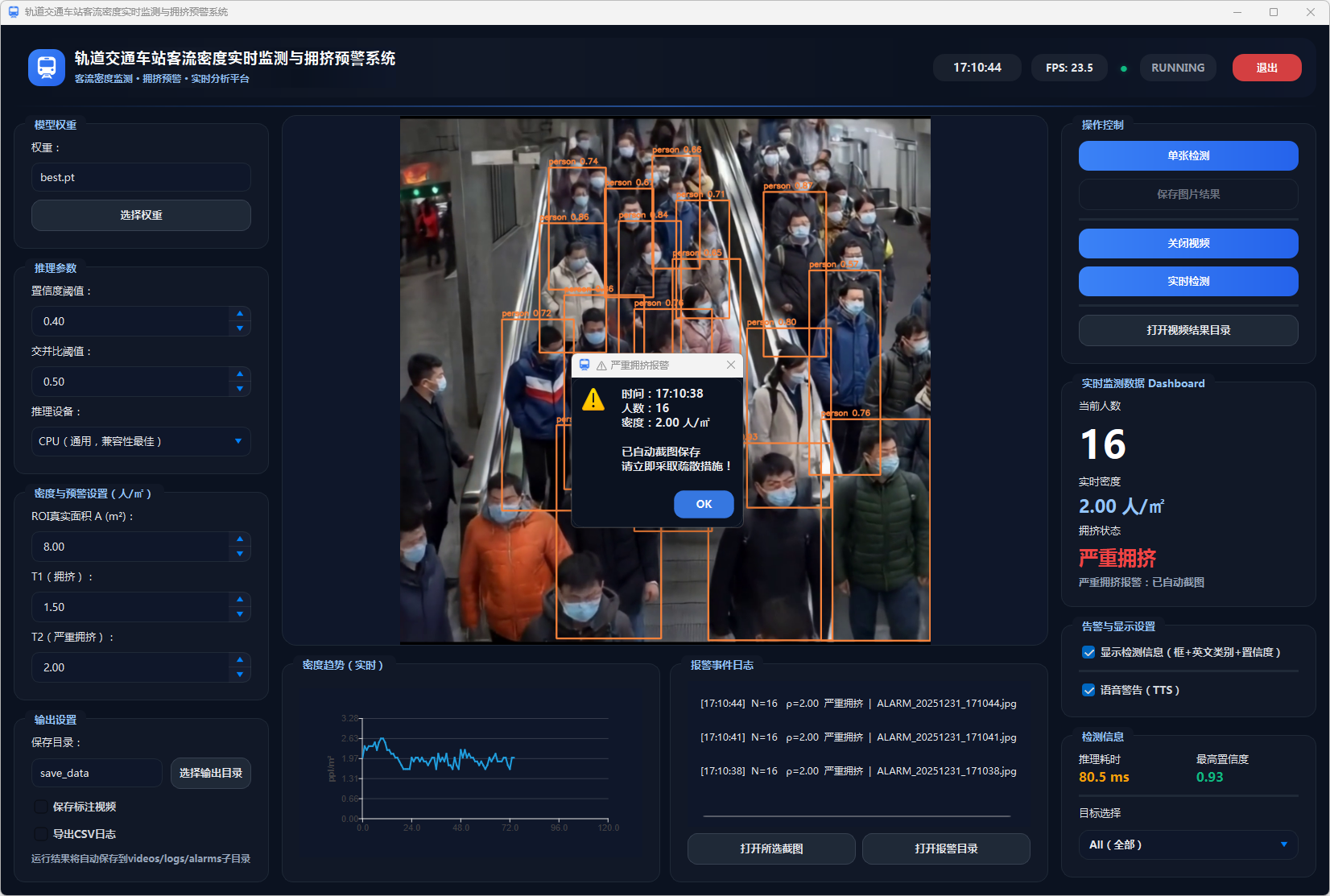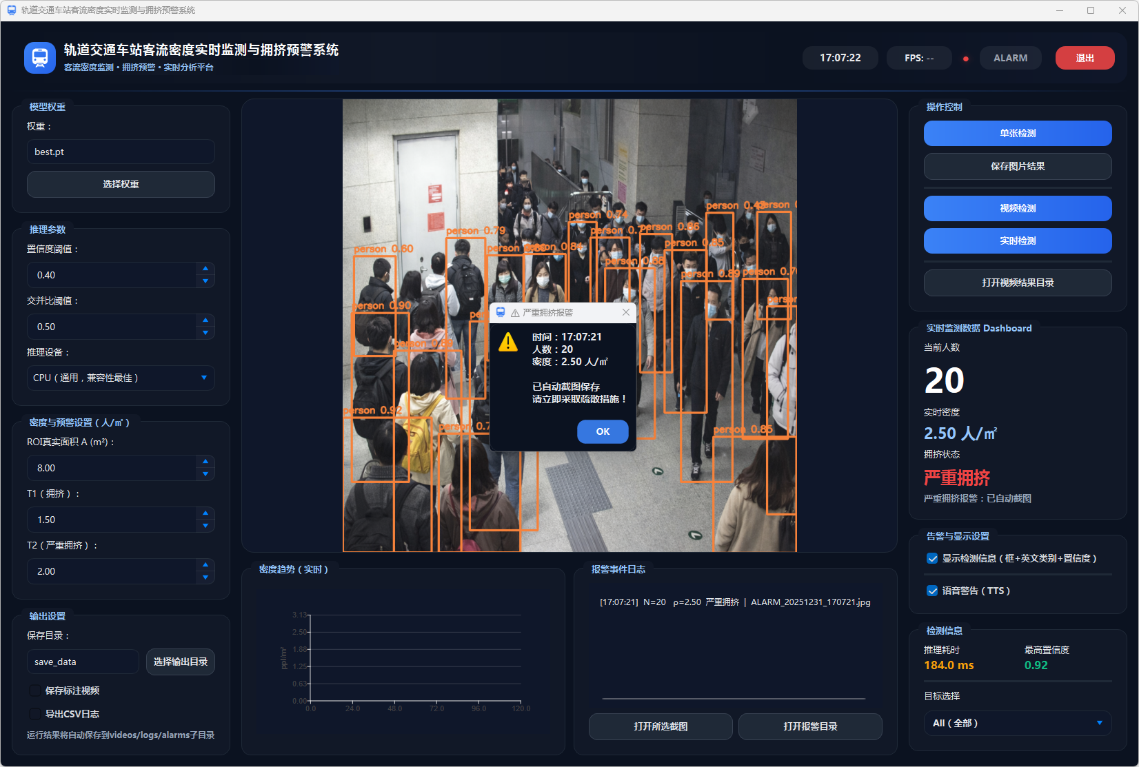 该系统通过基于YOLOv11的目标检测模型实时监测轨道交通车站内的客流密度,并结合预设的阈值触发拥挤预警,提供多种报警方式和数据导出功能,旨在提升车站的安全性和运营效率。