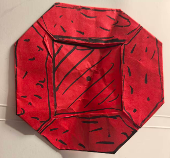 但是今年我们是小2班,幼儿不适合集体用剪刀,所以我想用手工纸15CM,做一个八边形的镜子。