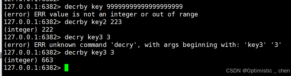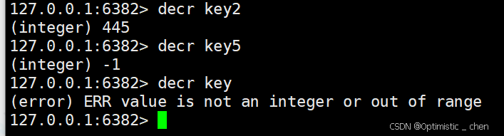 DECR的作用:将key对应的string 表示的数字减一(如果key不存在,则认为key对应的value是0;如果key的范围超过了64位有符号整型,则报错)