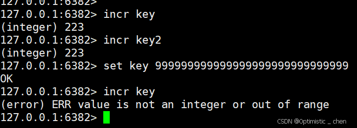 INCR的作用:将key对应的string表⽰的数字加一(如果key不存在,则认为key对应的value是0;如果key的范围超过了64位有符号整型,则报错)