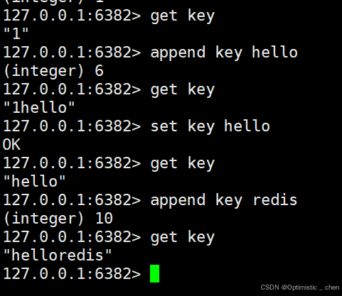 作用:如果key已经存在并且是⼀个string,命令会将value追加到原有string的后边。