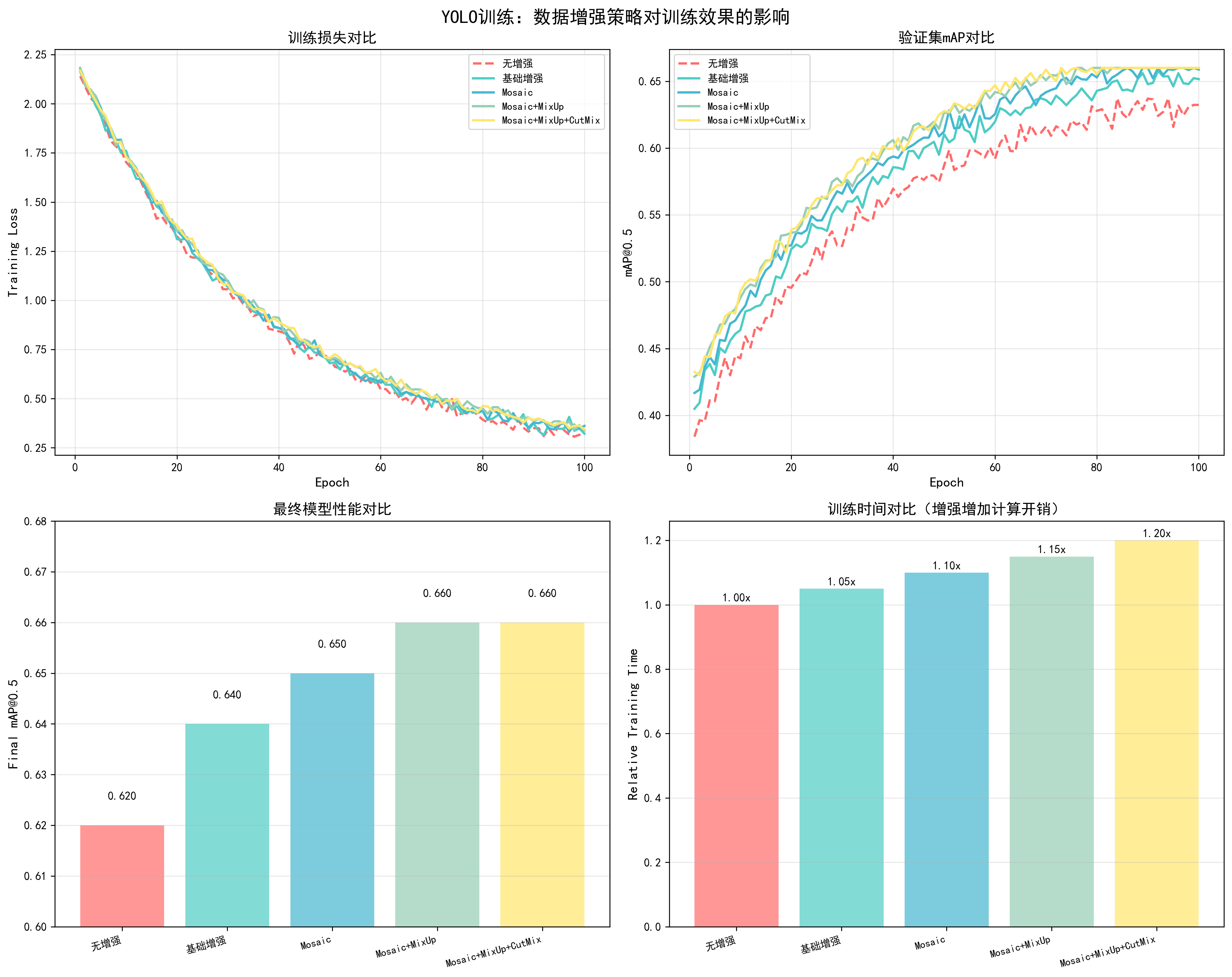 fig.suptitle('YOLO训练:数据增强策略对训练效果的影响', fontsize=16, fontweight='bold')