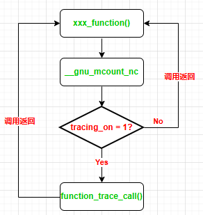 未开启 function 跟踪功能时(默认)时,__gnu_mcount_nc调用ftrace_trace_function函数指针指向的、不做任何工作的ftrace_stub()函数;在通过命令echo function > /sys/kernel/debug/tracing/current_tracer开启了 function 跟踪功能时,ftrace_trace_function将指向函数function_trace_call(),__gnu_mcount_nc将调用function_trace_call()执行函数追踪,即记录调用函数信息到trace ring buffer。该配置场景下,对所有函数的__gnu_mcount_nc调用一直存在,只是在未开启 function 跟踪功能时(默认)时,调用的是什么也不做的ftrace_stub();反之,则是调用做实际跟踪工作的function_trace_call()。 -