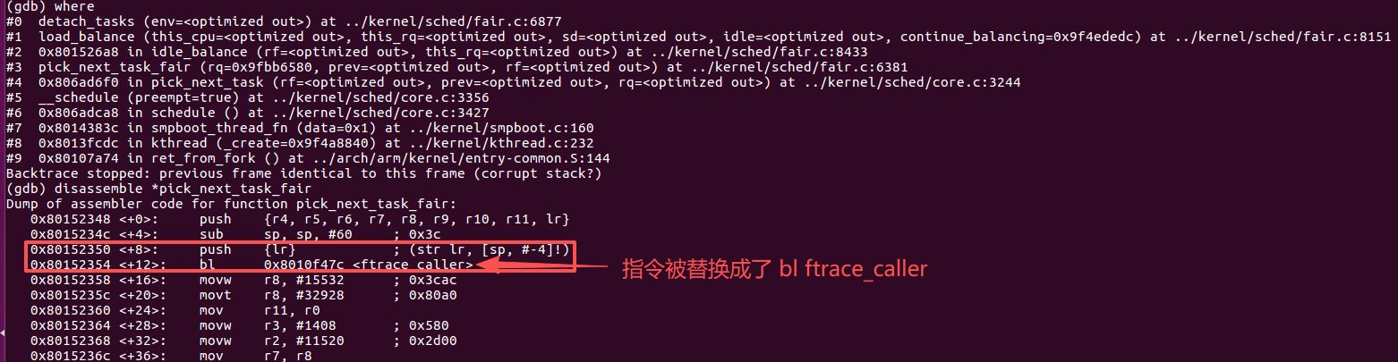 可以通过 GDB 调试内核,在执行命令 echo function > /sys/kernel/debug/tracing/current_tracer 后,在任意函数下断点,然后反汇编任意没有优化掉的函数来观察确认指令替换情况,下图是一个例子: