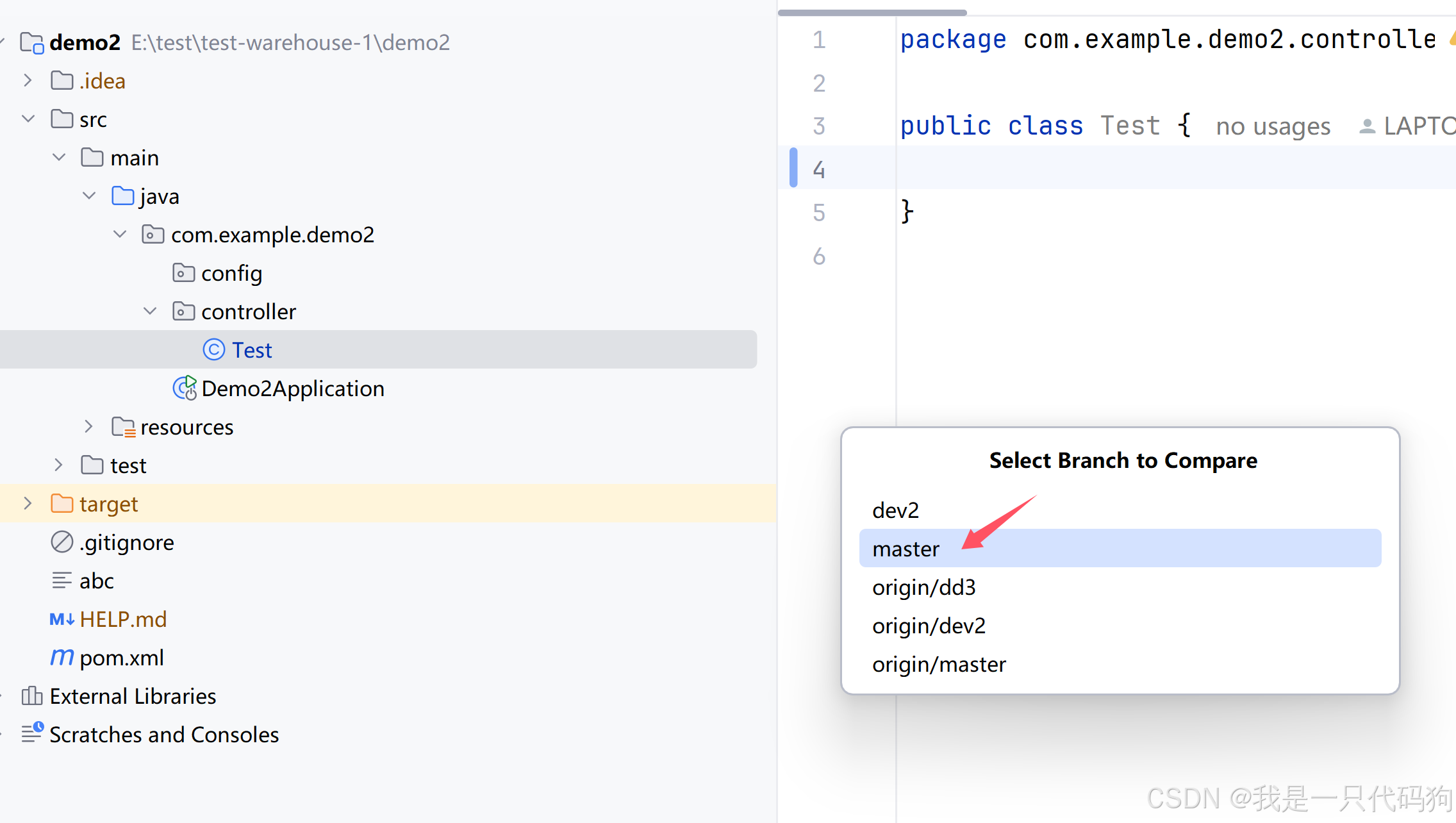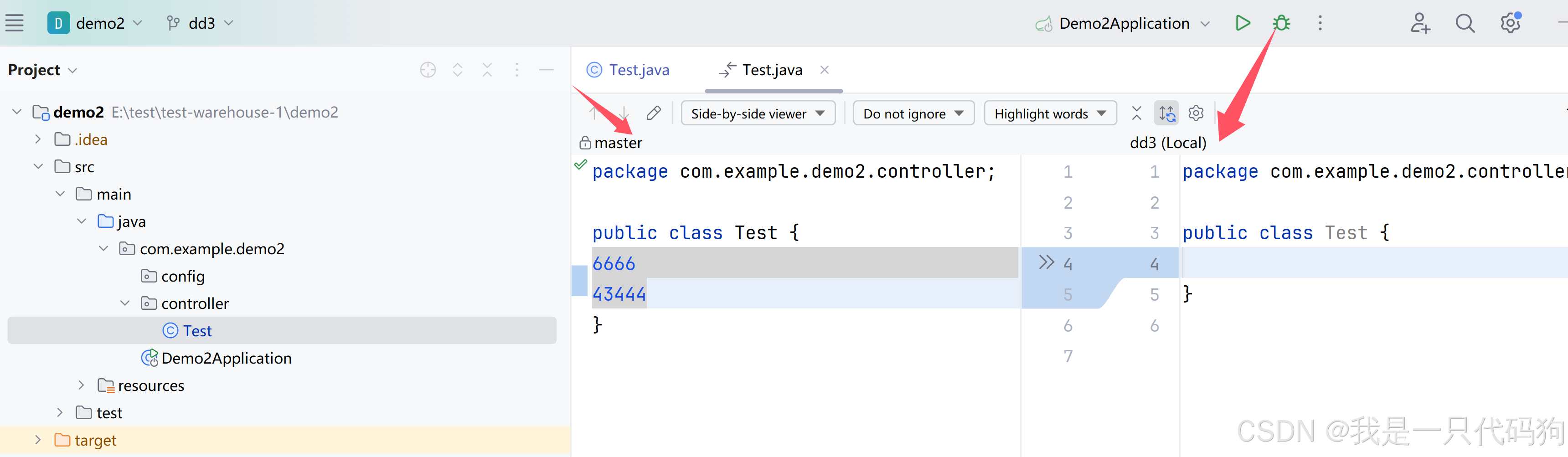 3.选择左边Test实体类,点击Test,看到右侧显示的master分支和dd3分支的代码,显示差异信息