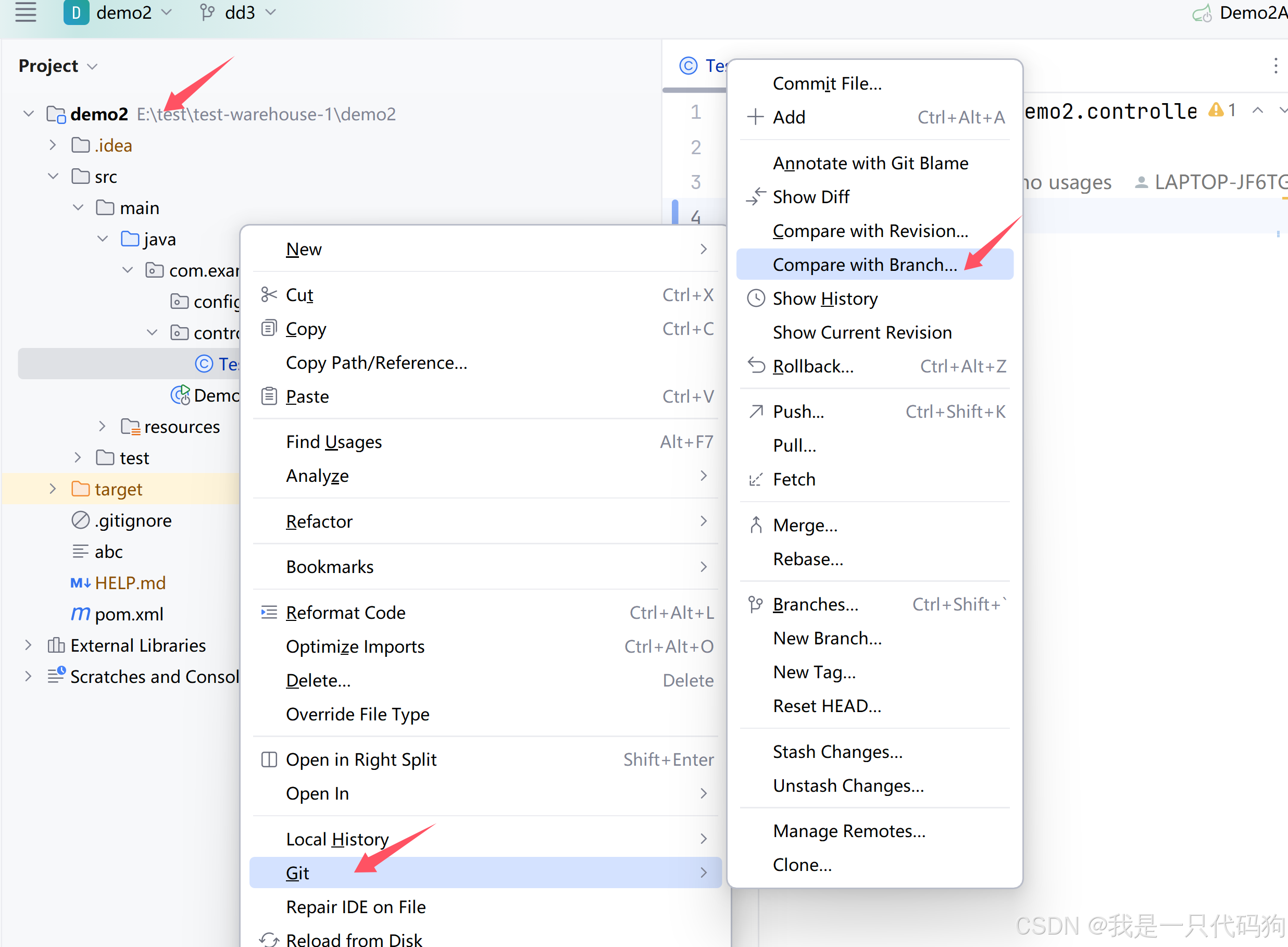 1.选择项目->鼠标右键->Git->Compare with Branch