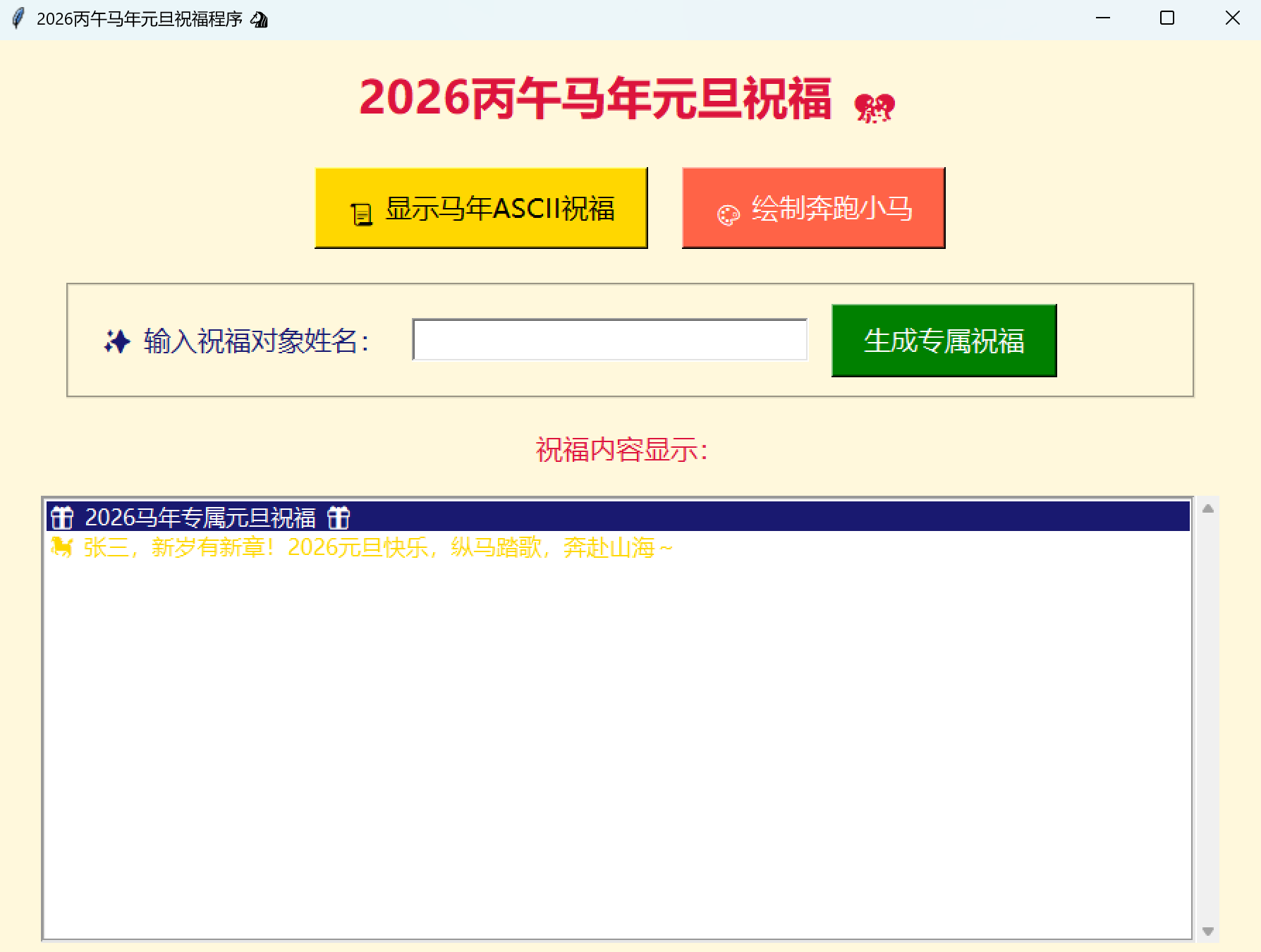 tag_configure设置不同颜色,写入文本框; - 个性化祝福:定义 12 条马年祝福模板,读取输入框姓名(默认 "朋友"),随机选模板替换占位符。