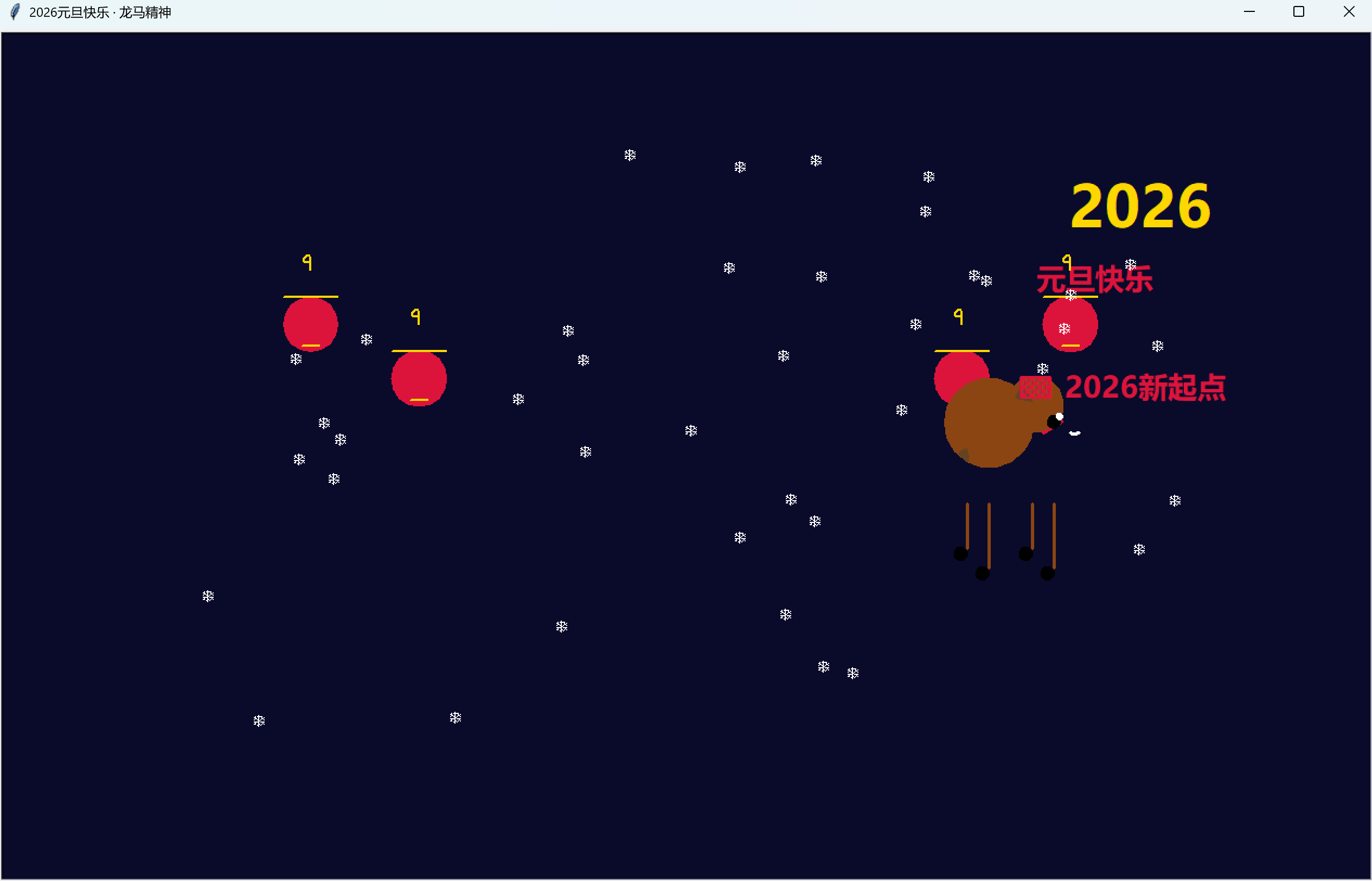 screen.tracer(0),手动调用screen.update(),提升动画流畅度; - 静态背景绘制:绘制 "2026""元旦快乐" 文字和灯笼,灯笼通过