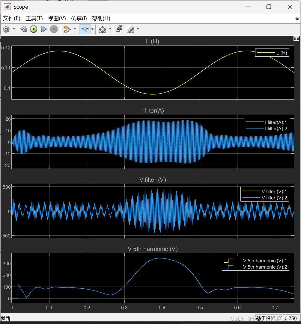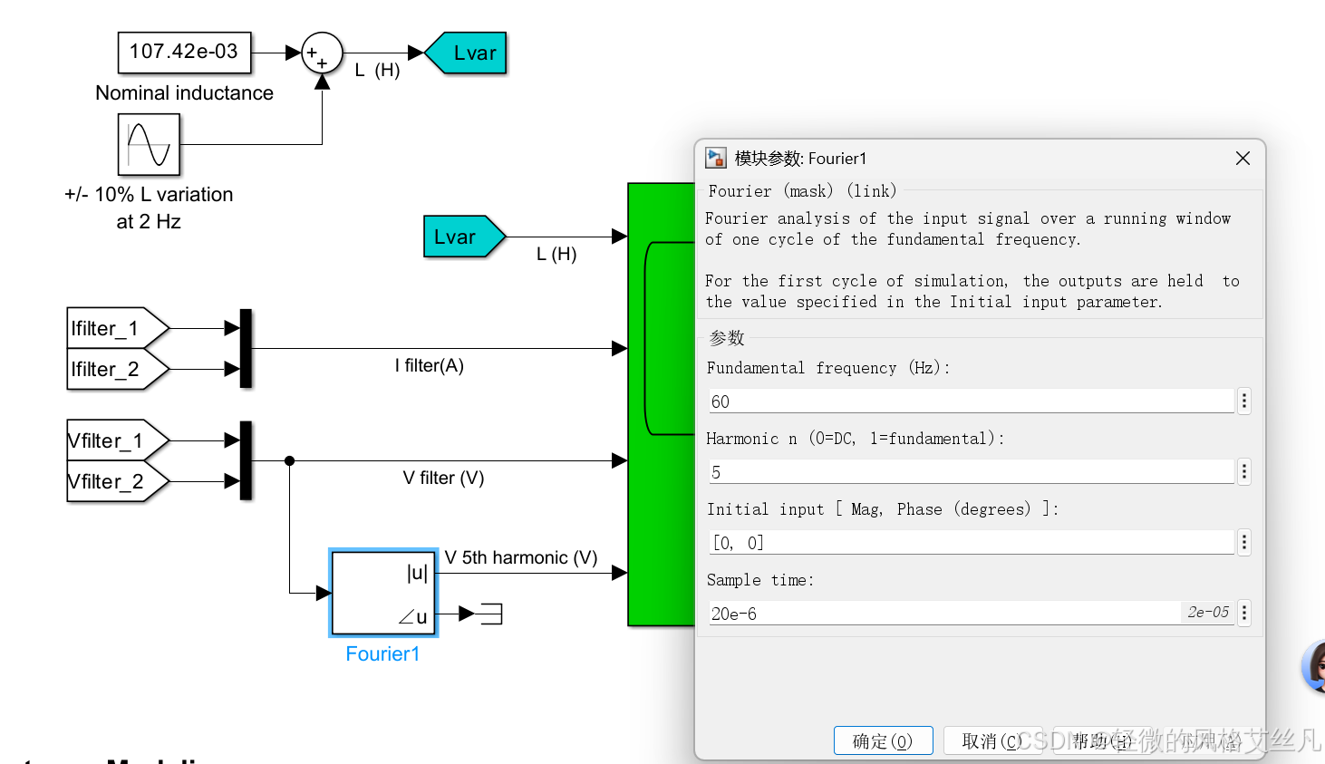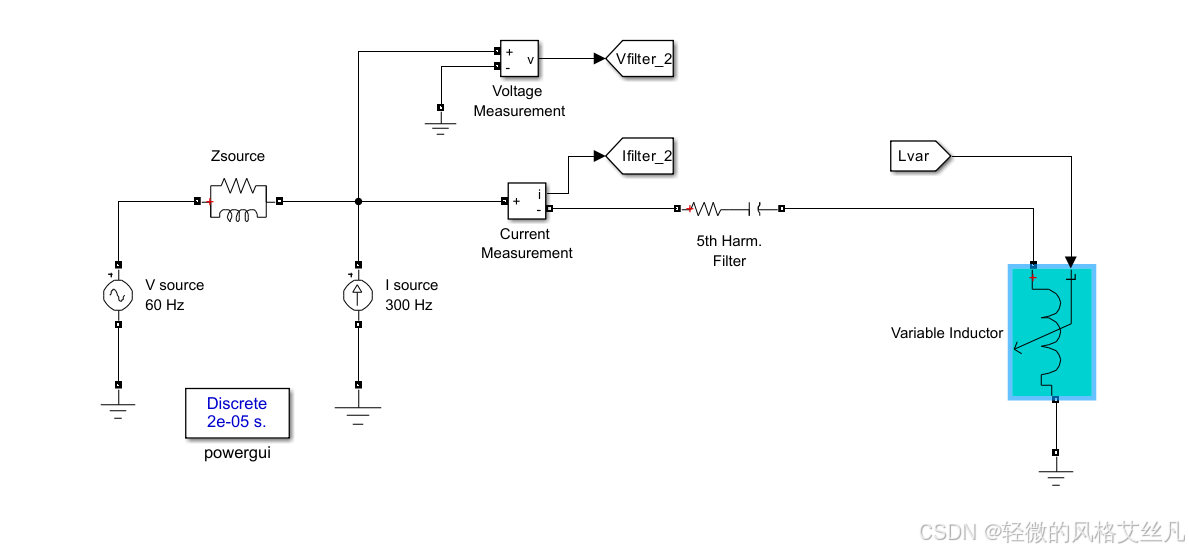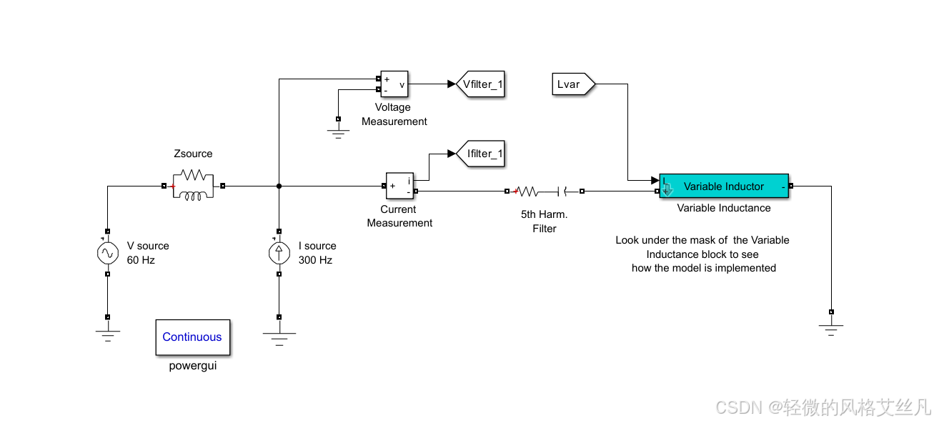 该可变电感器用于调谐至 5 次谐波的串联 LC 滤波器中。此滤波器与一个 60 赫兹 RL 电压源相连,且该电压源与一个 300 赫兹电流源并联。