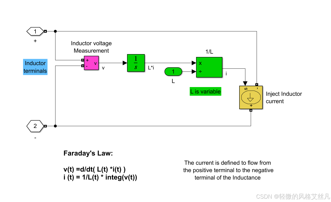 一组基础的法拉第定律,电流等于电压积分除以电感,由可控电流源和电压计组成。