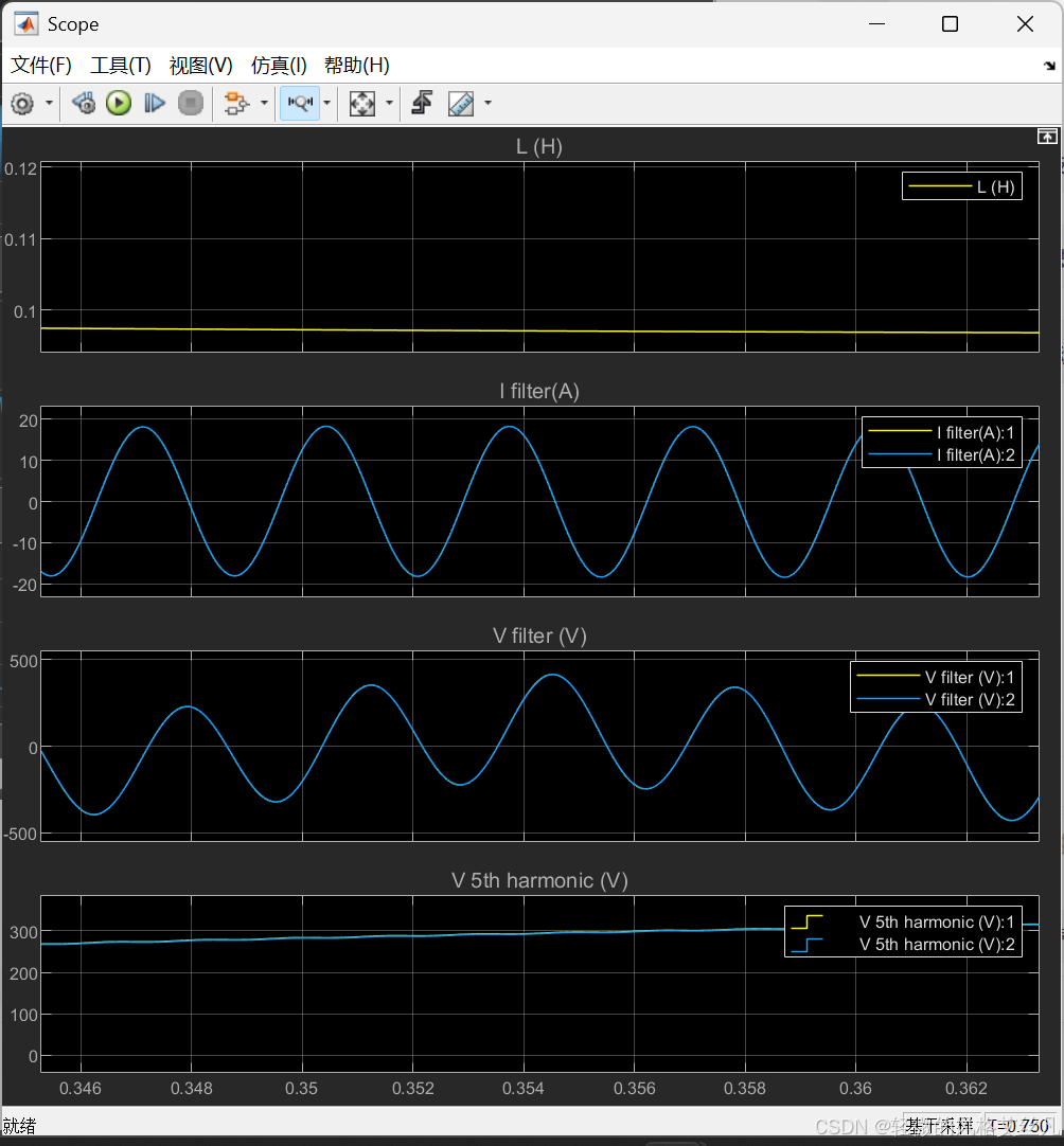 电感值以其额定值为中心,按正弦规律在 ±10% 的范围内变化。请对比连续模型与离散模型的滤波器电压和电流。