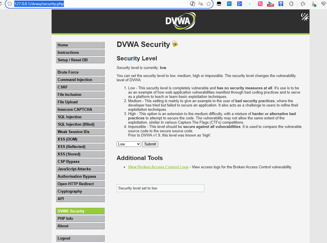 DVWA Security :: Damn Vulnerable Web Application (DVWA)账号:admin