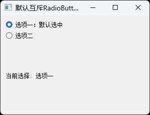 self.radio_option1 = QRadioButton("选项一:默认选中")