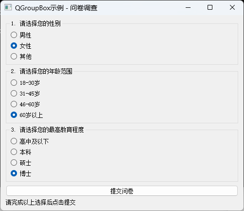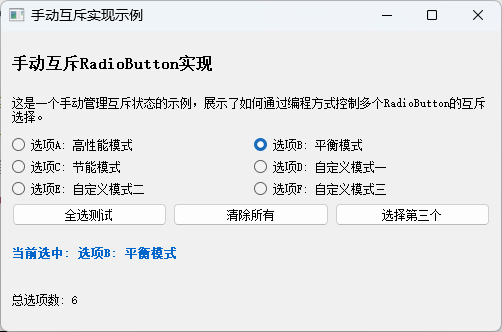 这种方法的核心原理是PyQt5会自动管理同一父容器中RadioButton的互斥性。当用户点击一个RadioButton时,Qt框架会自动取消同一容器中其他RadioButton的选中状态。这种自动管理的实现基于Qt的对象模型和信号槽机制,可以大大简化开发工作。