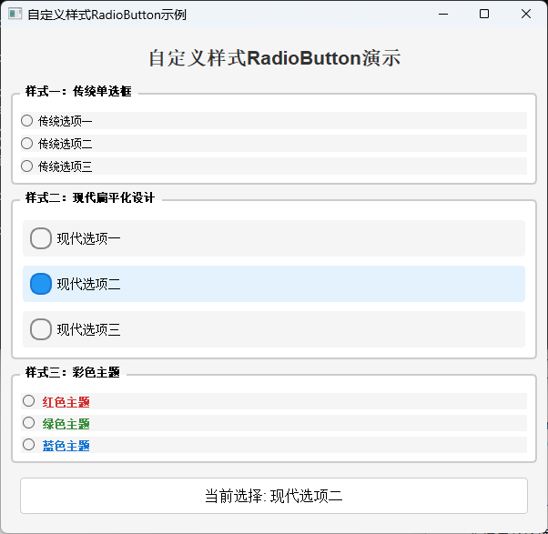 self.selection_label.setText("当前选择: 选项二")
