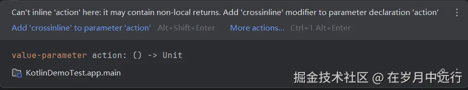 3处和4处满足了是inline函数和在表达式中,而且无法确定action中会不会包含return语句。inline受限严重,这里只有突破这个限制才可以,所以这里采用的方式就是把action加个crossinline修饰符。