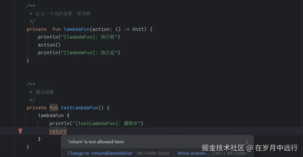 在测试函数中调用高阶函数lambdaFun,看到这里使用return语句,提醒 return@lambdaFun,如果我只使用return的话,那么就需要把lambdaFun定义成内联函数。