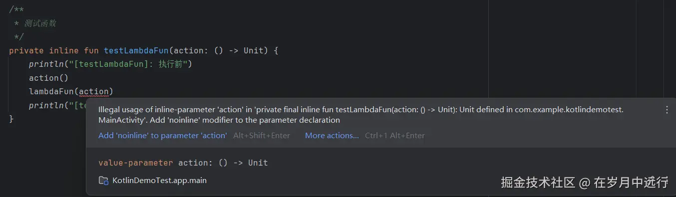 在内联函数testLambdaFun中调用lambdaFun高阶函数,想把action传给lambadFun,但是在被inline修饰的函数,其参数也会被铺平,也就不会再是函数类型了。所以编译报错了。所有这里的action要使用noinline来修饰。
