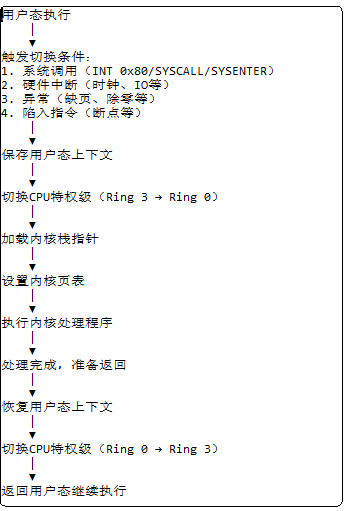 | I/O操作 | 必须通过系统调用 | 可直接进行I/O操作 |