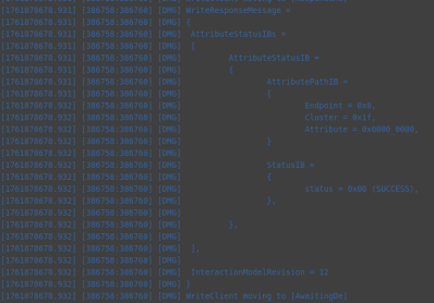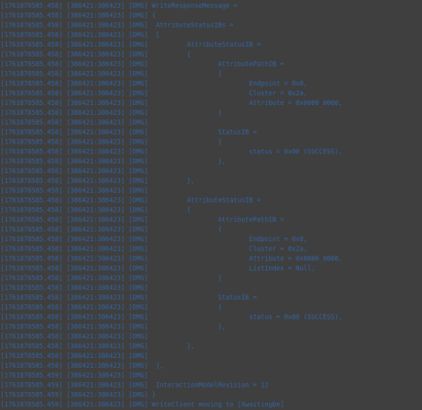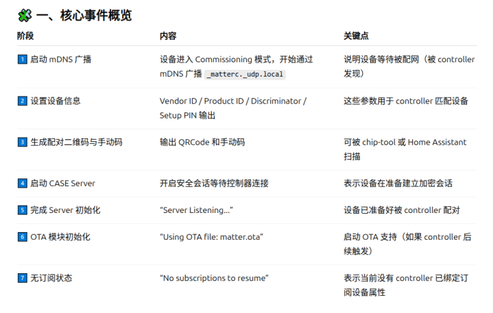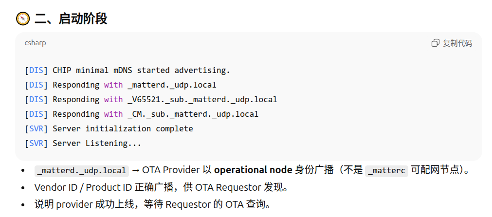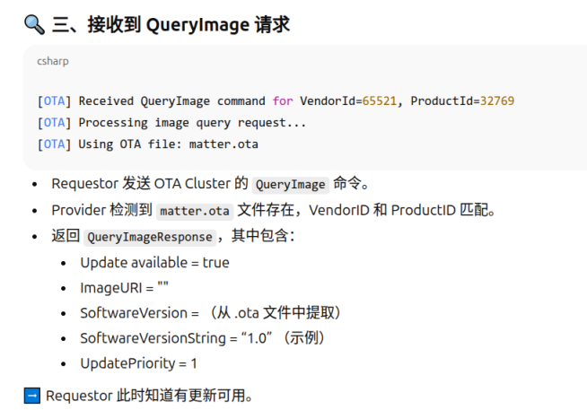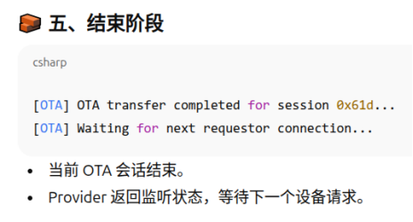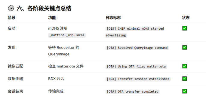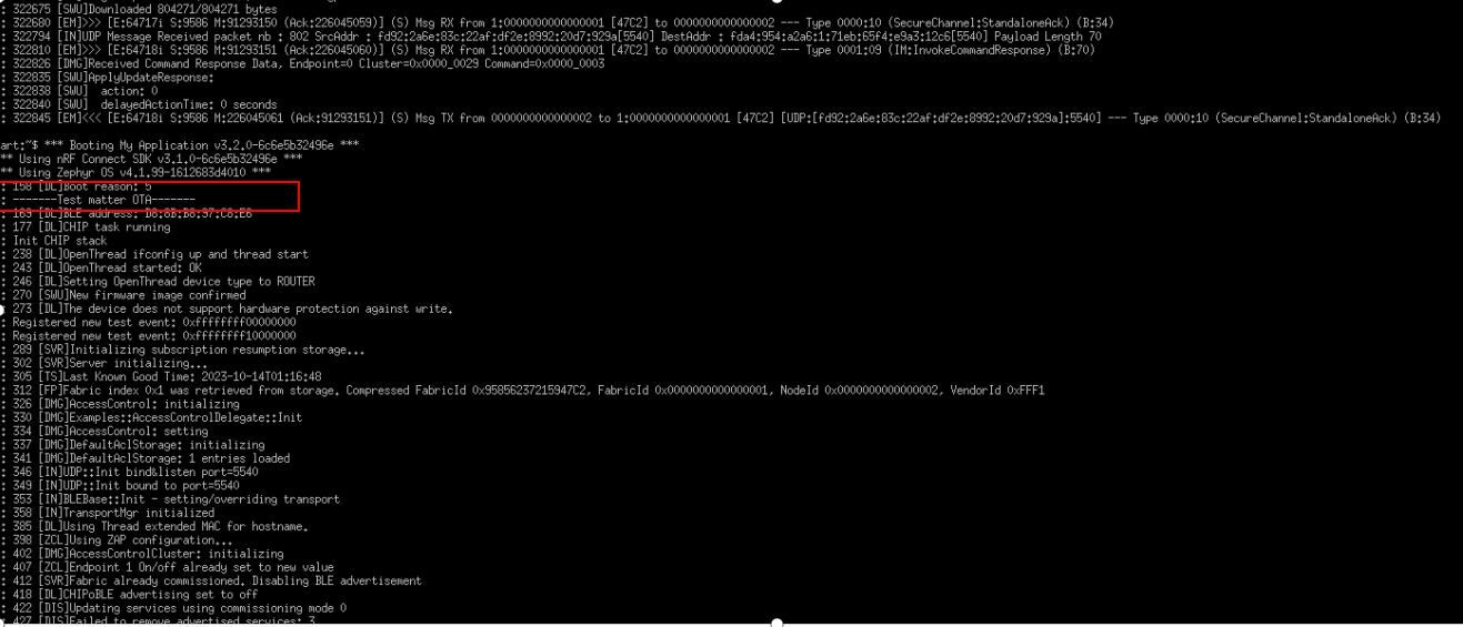 112233\]不是必须  8. Initiate the DFU procedure in one of the following ways: If you have built the device firmware with -DCONFIG_CHIP_LIB_SHELL=y option, which enables Matter shell commands, run the following command on the device shell: matter ota query 代码中需要配置  或者Otherwise, use chip-tool to send the Announce OTA Provider command to the device (the numeric arguments are Provider Node ID, Provider Vendor ID, Announcement Reason, Provider Endpoint ID, Requestor Node ID and Requestor Endpoint ID, respectively): ./out/chiptool/chip-tool otasoftwareupdaterequestor announce-otaprovider 1 0 0 0 2 0 |----------------------------|---------------------------------------------------------------| | 部分 | 含义 | | ./out/chiptool/chip-tool | 控制器工具(chip-tool 可执行文件) | | otasoftwareupdaterequestor | 目标 cluster:OTA Software Update Requestor | | announce-otaprovider | cluster 命令:通知设备有新的 OTA Provider | | 1 | Provider Node ID → OTA Provider 的节点号 | | 0 | Provider Vendor ID(通常 0 表示任意厂商) | | 0 | Announcement Reason(通知原因,0=默认、通常表示"初始可用") | | 0 | Provider Endpoint ID(Provider 上的 OTA Cluster endpoint,一般是 0) | | 2 | Requestor Node ID(设备端的节点号) | | 0 | Requestor Endpoint ID(Requestor 的 OTA Cluster endpoint,一般是 0) | ## Provider OTA LOG分析     镜像总大小(传输的字节数)≈ 804,357 字节(约 785.8 KiB,约 0.804 MB)。 传输持续时间 ≈ 231.156 秒 = 3 分 51.156 秒。 满块大小 = 1024 字节。总块数 786 个块   ## 设备OTA LOG  ## 参考资料 [https://docs.nordicsemi.com/bundle/ncs-2.2.0/page/nrf/ug_matter_overview_dfu.html](https://docs.nordicsemi.com/bundle/ncs-2.2.0/page/nrf/ug_matter_overview_dfu.html "https://docs.nordicsemi.com/bundle/ncs-2.2.0/page/nrf/ug_matter_overview_dfu.html") [https://docs.nordicsemi.com/bundle/ncs-latest/page/matter/nrfconnect_examples_software_update.html](https://docs.nordicsemi.com/bundle/ncs-latest/page/matter/nrfconnect_examples_software_update.html "https://docs.nordicsemi.com/bundle/ncs-latest/page/matter/nrfconnect_examples_software_update.html")