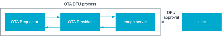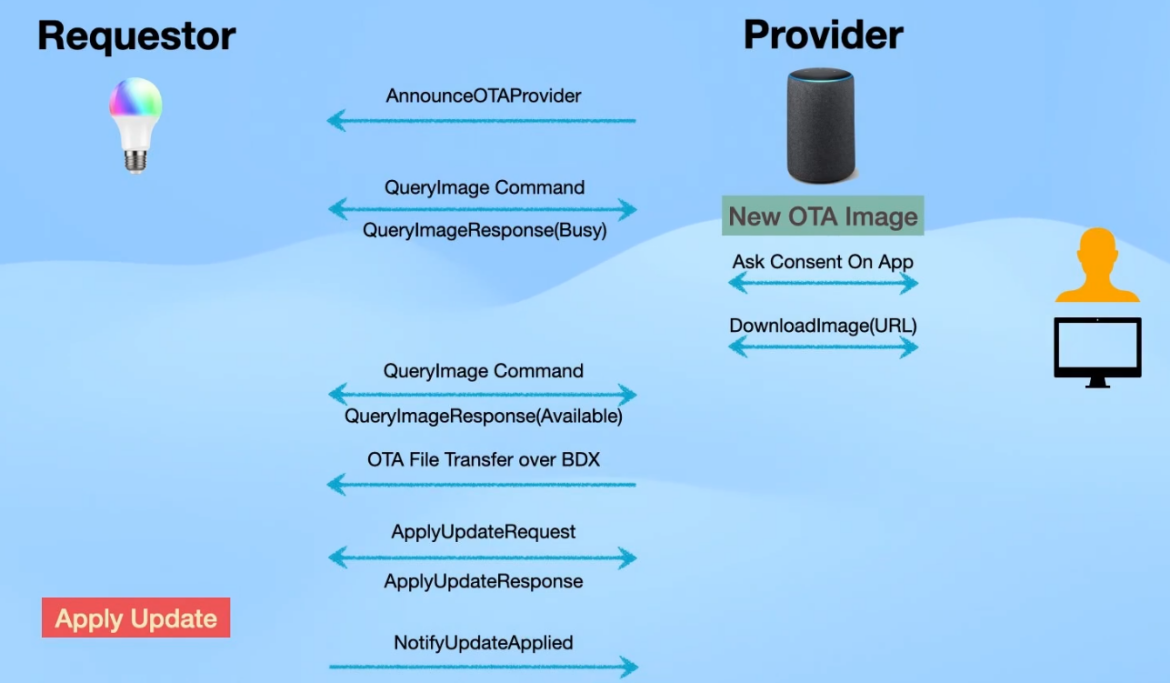 Matter 的空中升级(OTA)是一种允许 Matter 网络中的 Matter 设备更新其固件的过程。大多数 Matter 设备在其生命周期中的某个阶段都需要进行此类更新。软件镜像由另一个 Matter 节点提供,该节点获取了设备信息并从集中可靠的源下载了该镜像。下载过程通过特殊的传输协议进行,并且需要用户同意才能将镜像应用到目标 Matter 设备上。