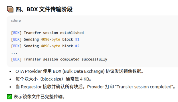 该协议基于简单文件传输协议 (TFTP)。BDX 不要求传输的文件具有任何特定格式,但允许向文件附加任意元数据。当用于 OTA 传输时,OTA 提供程序使用以下格式向 OTA 请求程序发送 URI:`<node-id>:<file-name>: <node-id> bdx://<node-id>/<file-name> :<file-name>:<file-name> `,其中`<node-id> ` 对应于要接收镜像的 OTA 请求程序的节点 ID,` *<file-name>`*是用于唯一标识节点上软件镜像文件的任意文件路径。