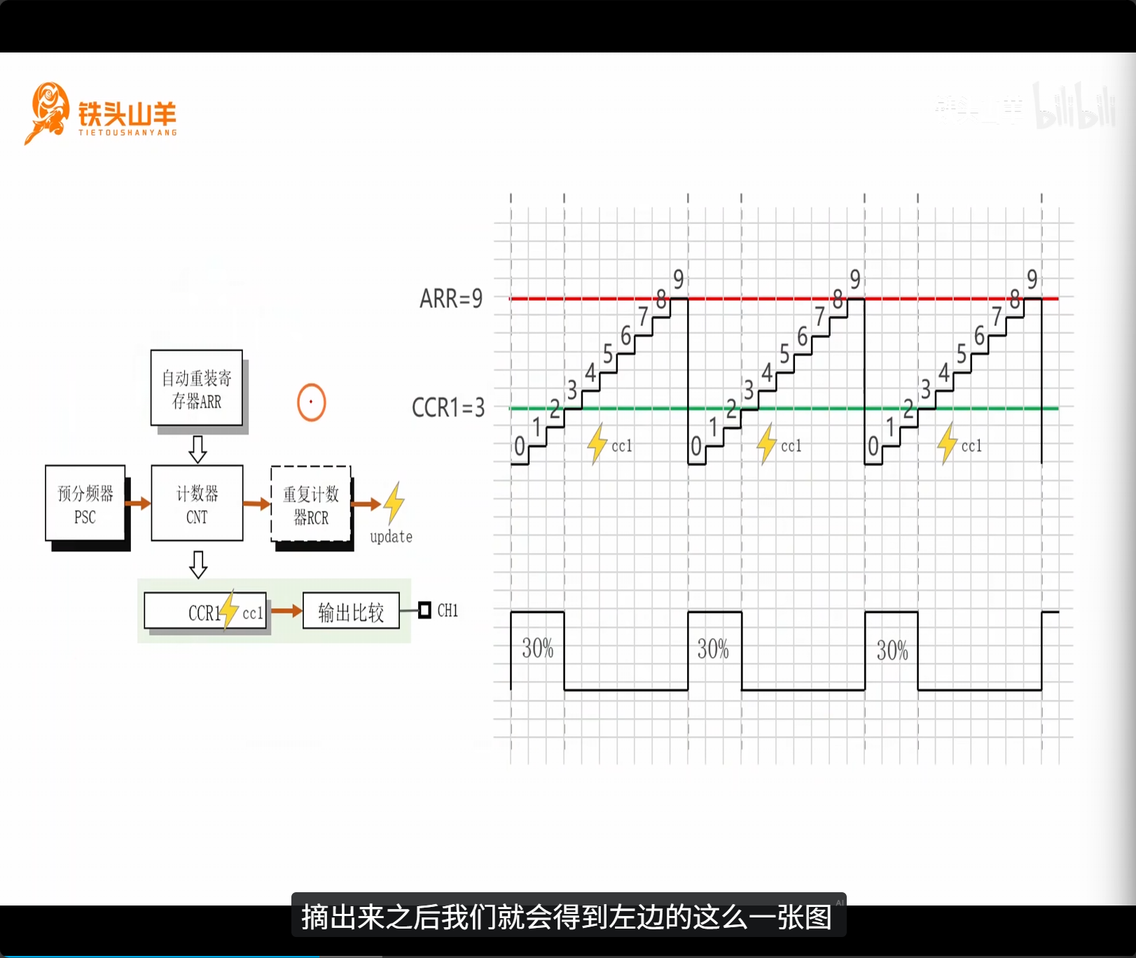 启动时基单元,每来一个脉冲, CNT 会++,到 ARR +1 会溢出重装。上图右为实际波形示意图。绿线为 CCR 值,红线为 ARR 值。