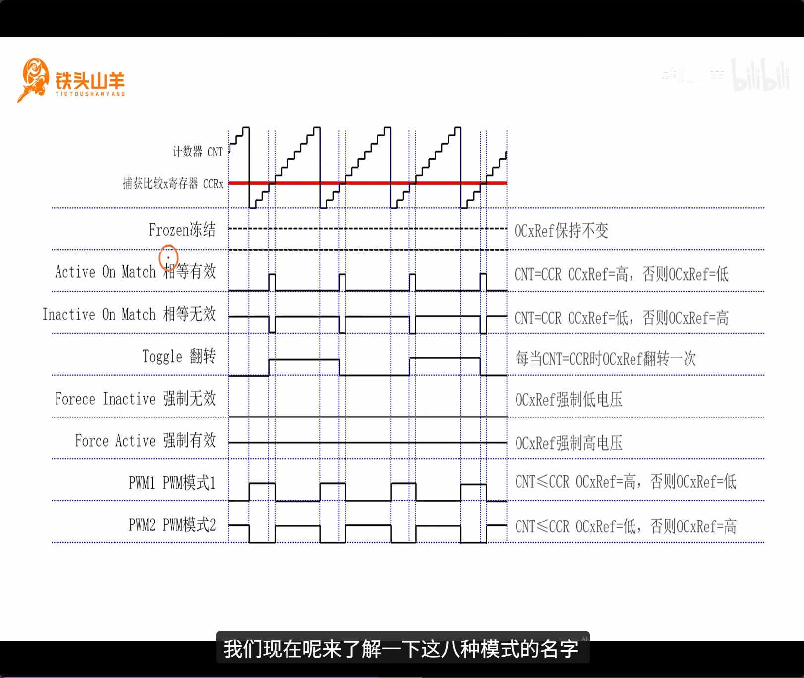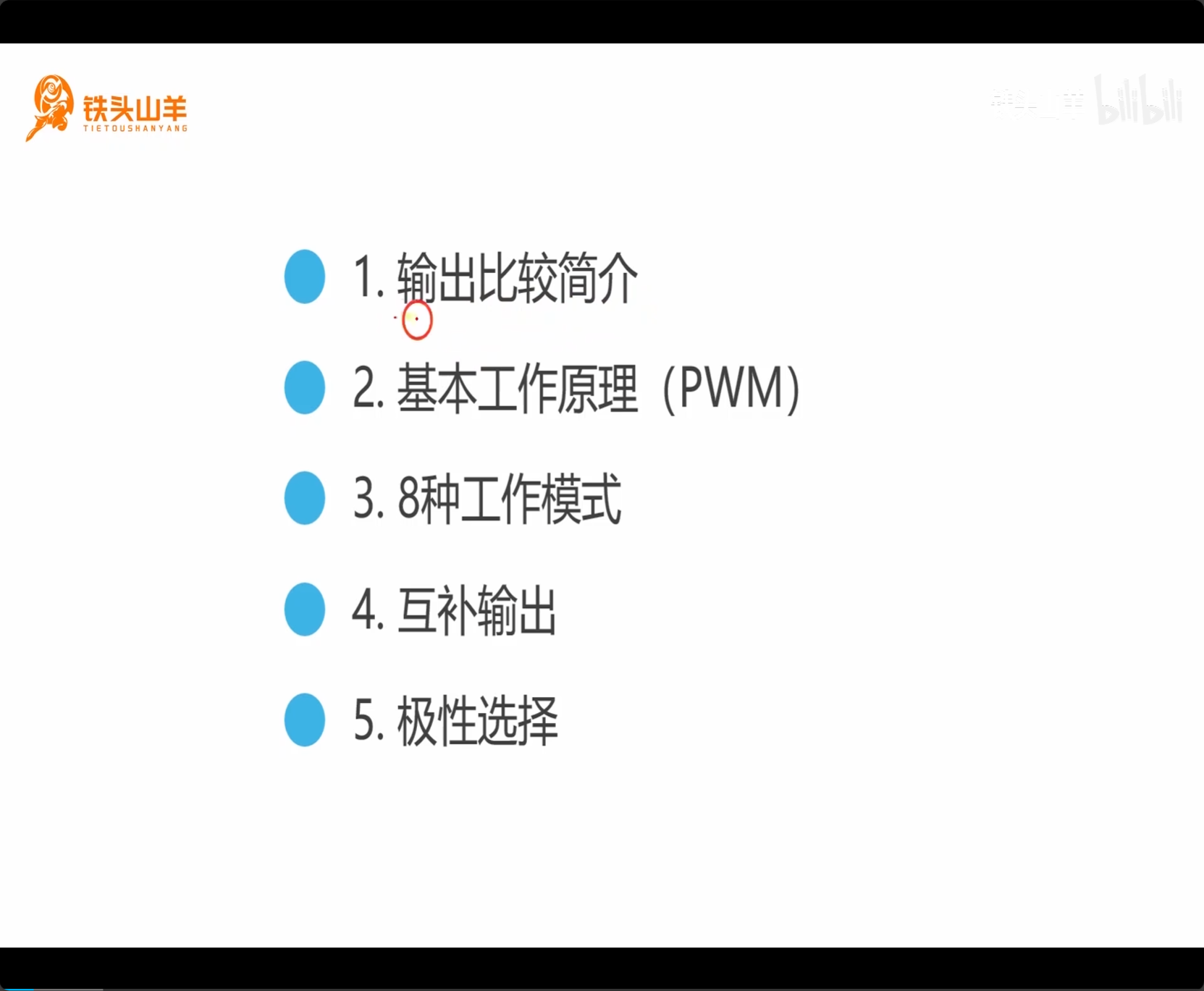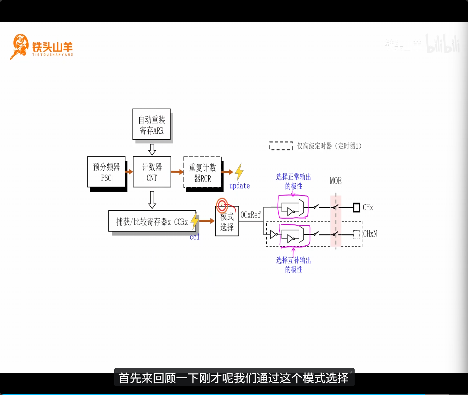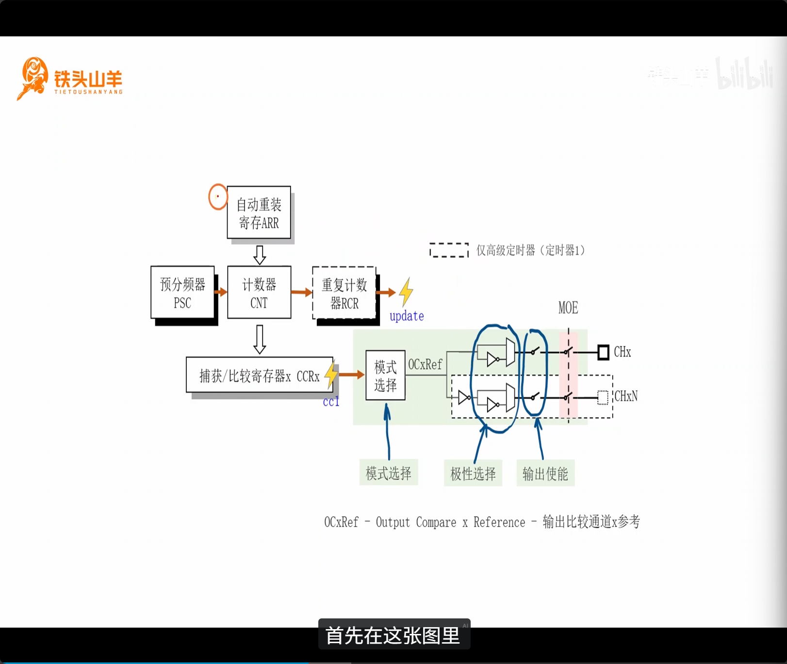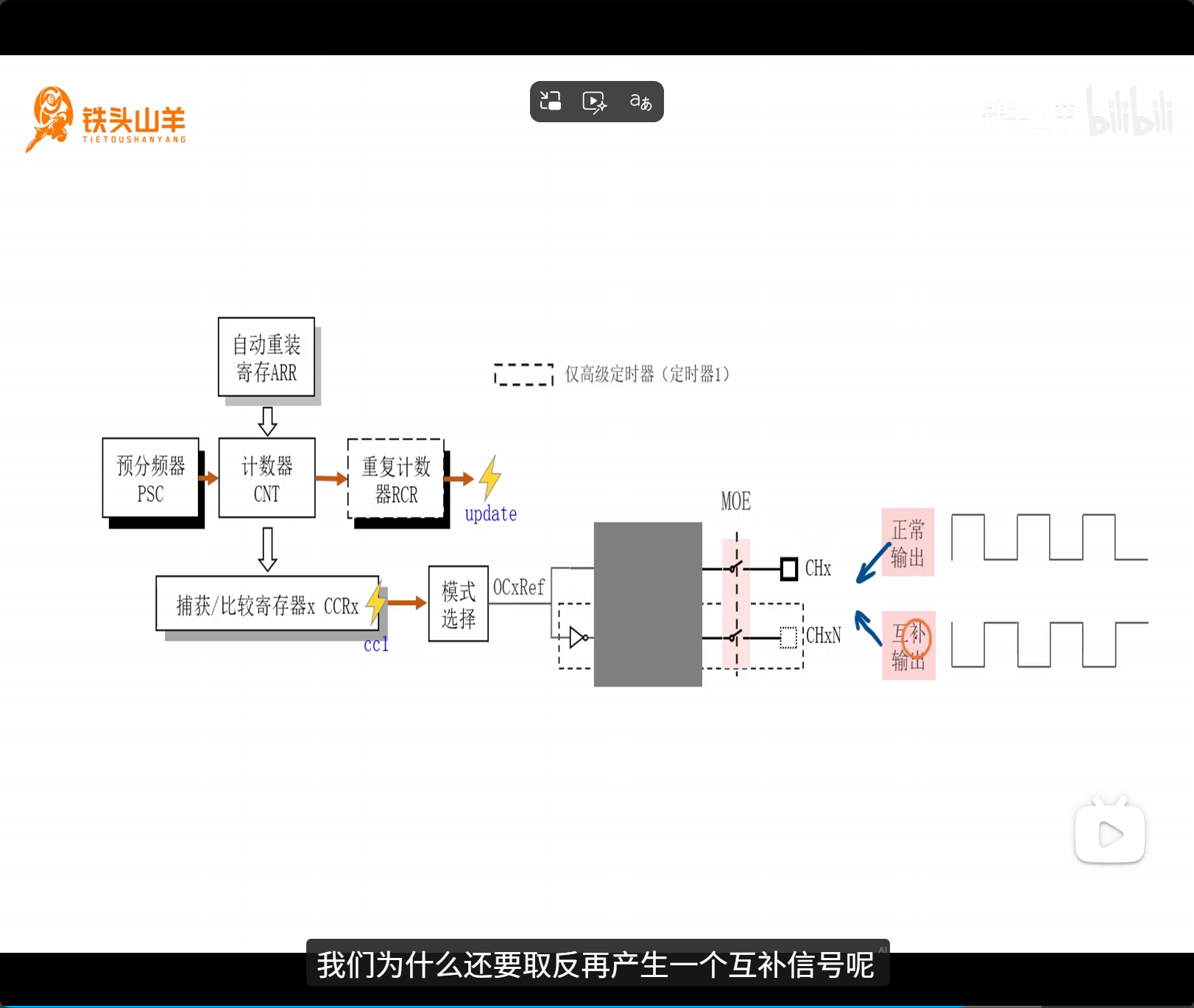 先简单了解了输出比较和工作原理(CNT 和 CCR 比较),然后通过 8 种工作模式(主要 PWM1 模式)、互补输出(与正常输出相反)、极性选择(信号取反),深入了解了下输出比较内部结构 。