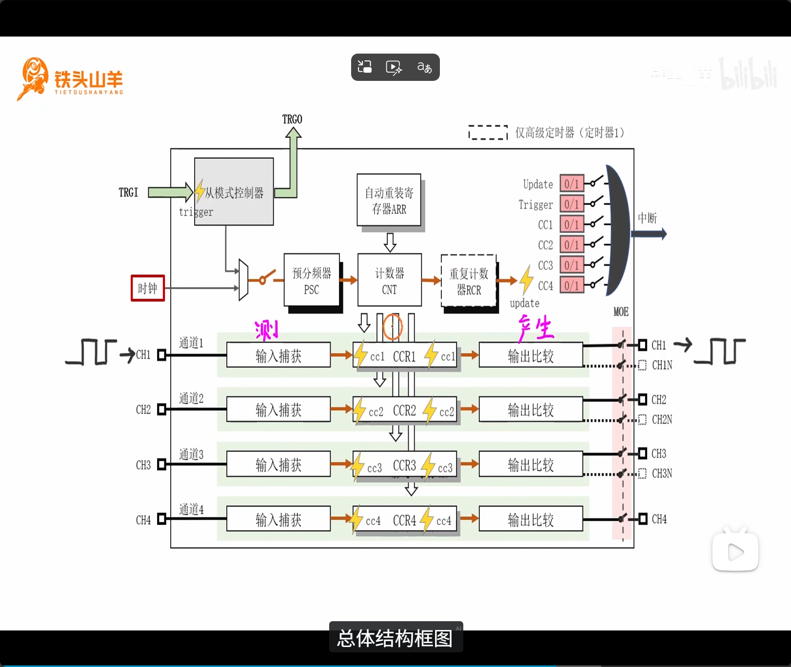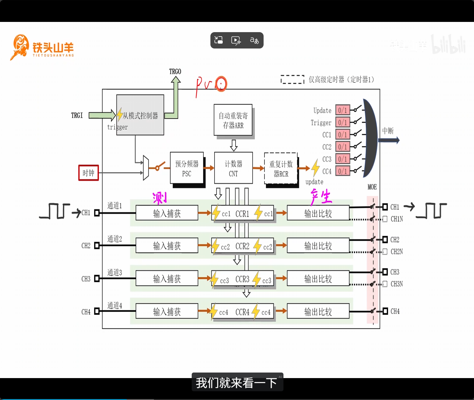 CCRx:捕获/比较寄存器、CCR 左边为输入捕获,右边为输出比较