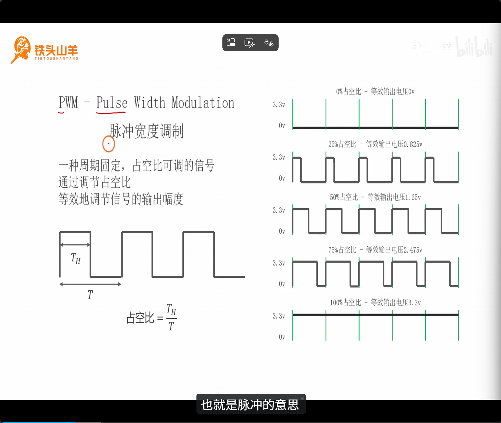 Q:为什么调节占空比就能输出 0-3.3V 之间的电压?高电平不就是 3.3V,低电平不就是 0V 吗?