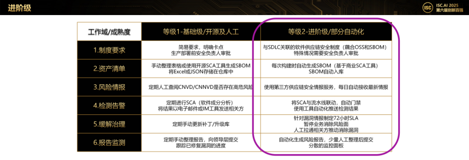 进阶级的核心是实现部分自动化,将供应链安全融入软件开发生命周期(SDLC),这也是目前大多数甲方客户所处的阶段------因为很多企业早年已开展DevOps或开发安全建设,具备一定的合规基础。