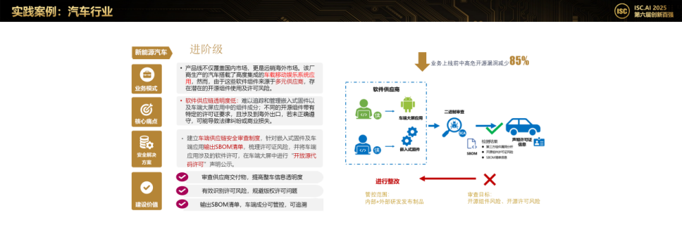 该企业通过建立车端供应链安全审查制度,实现了三大核心目标:一是针对嵌入式固件及车端应用输出完整SBOM清单,全面梳理组件成分和许可证风险;二是在车端大屏中进行"开放源代码许可"声明公示,满足合规要求;三是审查供应商交付物,提高整车信息透明度。