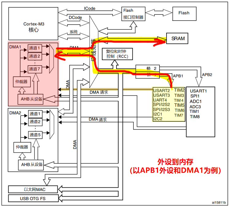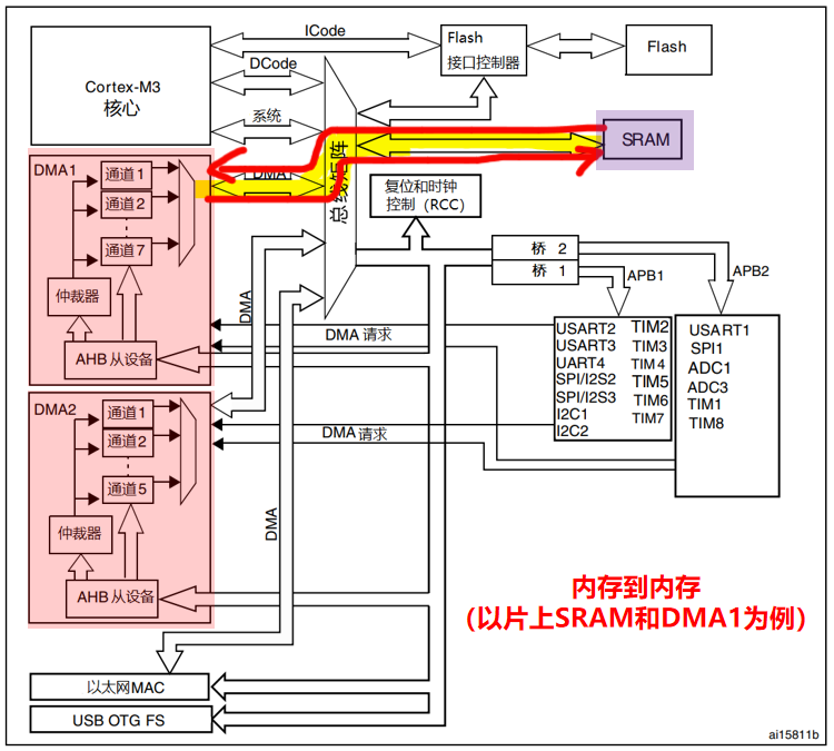 SRAM →(AHB 总线)→ DMA 控制器 →(APB 总线)→ SRAM