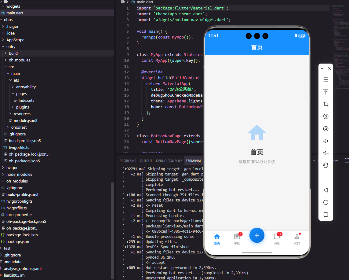 底部导航栏是OA系统中最常用的导航组件,它提供了在主要功能模块之间快速切换的能力。一个优秀的底部导航栏组件需要支持图标和文字展示、选中状态切换、角标提示、中间凸起按钮等功能。本文将详细介绍如何使用Flutter和OpenHarmony开发一个功能完善的底部导航栏组件。