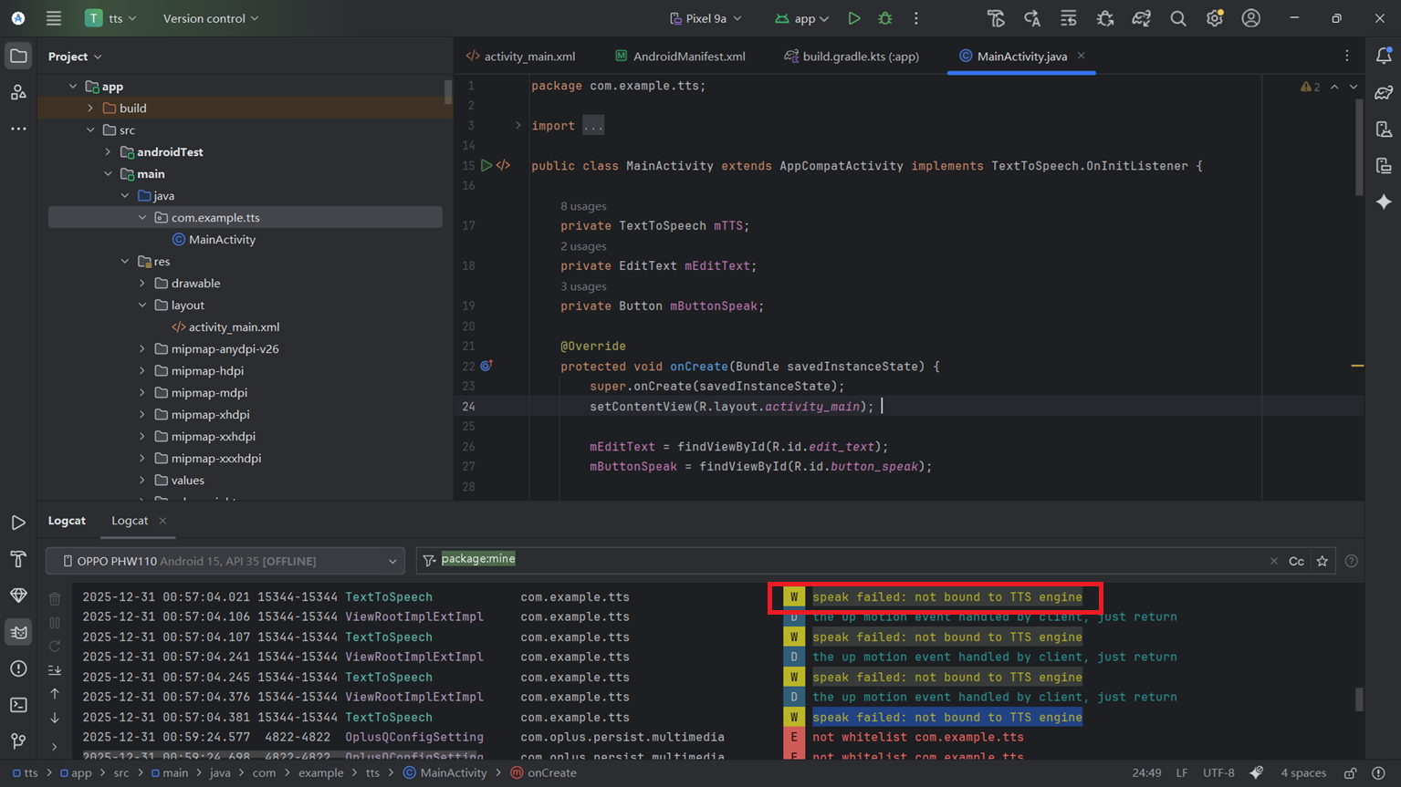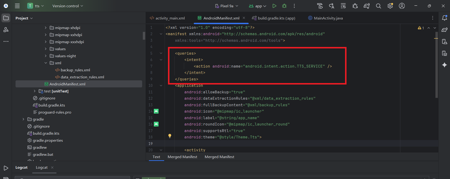 最近调试的时候发生了一个奇怪的问题,在用老版本的TTS可以进行语音播报,新版的不行,于是查了下资料发现,从 Android 11 开始,Google 增强了隐私保护,你的 App 默认无法"看见"手机里安装的其他 App(包括系统 TTS 引擎)。导致 TTS 初始化时找不到引擎,从而绑定失败。