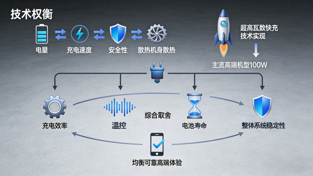 然而,电池容量、充电速度、安全性及机身散热之间存在着复杂的技术权衡。因此,即便在超高瓦数快充技术已实现的情况下,目前主流高端机型仍多将功率控制在100W左右。甚至华为、苹果等品牌的高端系列,充电功率低于100W。这是由于充电功率需在充电效率、温控、电池寿命以及整体系统稳定性之间,进行综合取舍,以确保用户获得更均衡、可靠的高端体验。