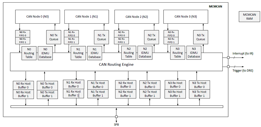CRE是CAN Module(MCMCAN)拓展用于路由CAN帧,可以实现硬件加速CAN TO CAN路由在同一个MCMCAN模块内、可以协助Data Routing Engine(DRE)执行硬件加速,例如CAN TO CAN路由在不同的MCMCAN Modules, CAN TO Ethernet (封装在IEEE 1722 ACF帧),CAN TO MEMORY(可用户定义)。因此可以硬件路由的优势在于可以实现自动信息传输(路由)之间的亮哥哥独立的CAN总线没有CPU的干预。