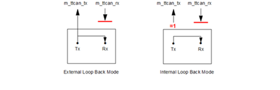 MCMCAN模块提供了一个内部回路模式,使用MCMCAN模块的系统内测试以及CAN驱动软件的开发无需访问外部CAN总线。Loopback功能由内部CAN总线(MCMCAN模块内)和每个CAN节点的总线选择开关组成,使用改开关,每个CAN节点既可以连接到内部CAN总线(Internal loopback mode)也可以连接到外部CAN总线,分别发送和接收引脚(正常操作)。当前未选择的CAN总线是隐性驱动;这意味着发送引脚保持在1,而处于环回模式的CAN节点忽略接收引脚。通过设置节点x端口控制寄存器位Ni PORTCTRL (i0-3). lbm, CAN节点x选择内部环回模式。所有处于环回模式的CAN节点可以通过内部CAN总线一起通信,而不会影响其他未处于环回模式的CAN节点的正常运行。