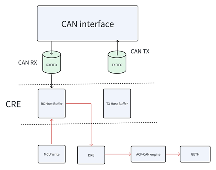实现功能:CRE可以直接写RX Host Buffer 1,软件触发DRE,实现MCU发送数据,利用ACF-CAN Assembler打包成1722格式发送至GETH。