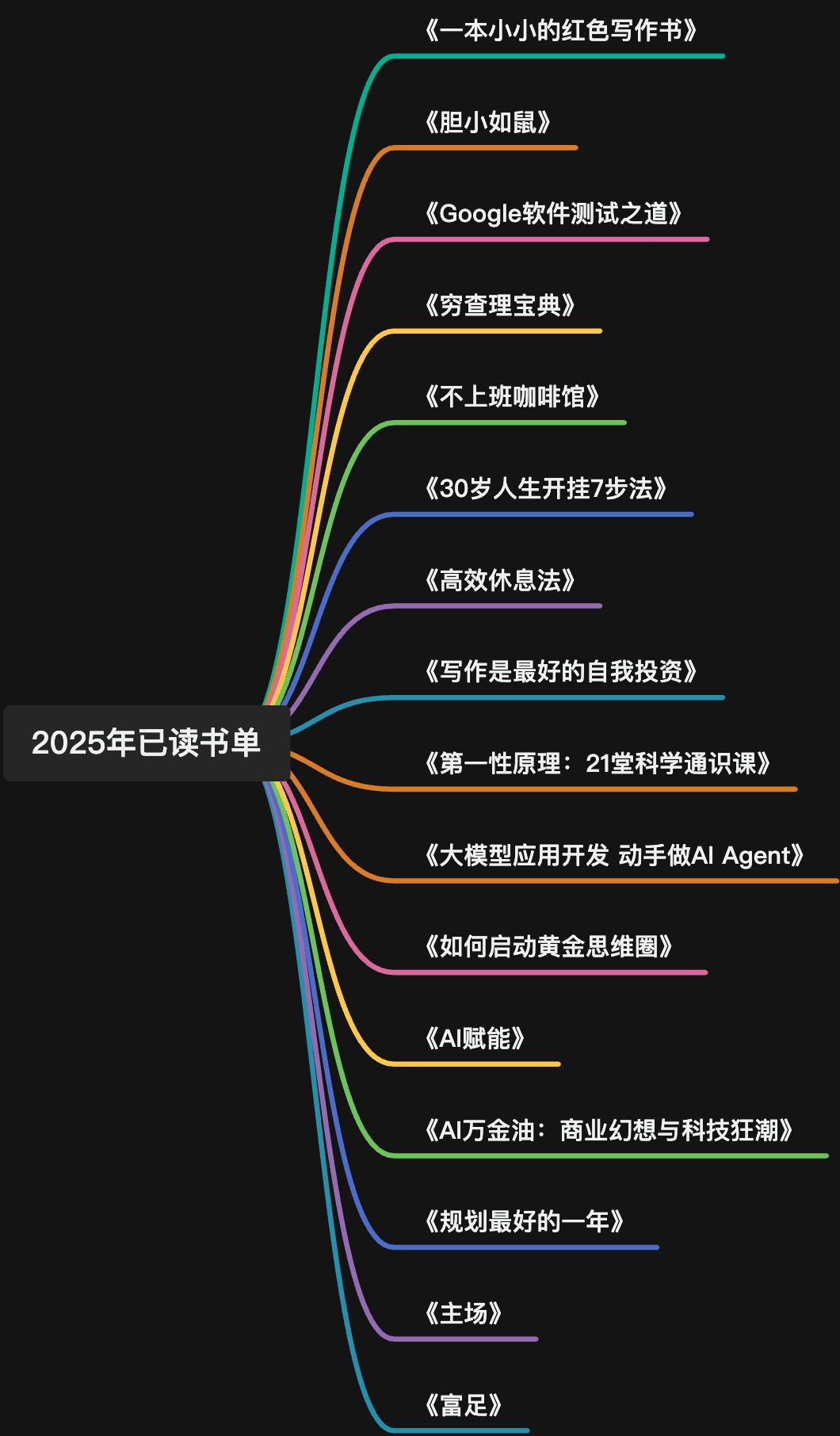 今年的书单主要集中在AI、思维提升 和个人成长类,阅读速度比较慢,每天15分钟。